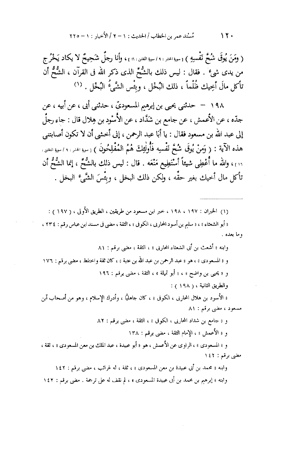 198 - حَدَّثَنِي يَحْيَى بْنُ إِبْرَاهِيمَ الْمَسْعُودِيُّ، حَدَّثَنِي أَبِي، عَنْ أَبِيهِ، عَنْ جَدِّهِ، عَنِ الْأَعْمَشِ، عَنْ جَامِعِ بْنِ شَدَّادٍ، عَنِ الْأَسْوَدِ بْنِ هِلَالِ، قَالَ: جَاءَ رَجُلٌ إِلَى عَبْدِ اللَّهِ بْنِ مَسْعُودٍ، فَقَالَ: يَا أَبَا عَبْدِ الرَّحْمَنِ، إِنِّي أَخْشَى أَنْ لَا تَكُونَ أَصَابَتْنِي هَذِهِ الْآيَةُ: {وَمَنْ يُوقَ شُحَّ نَفْسِهِ فَأُولَئِكَ هُمُ الْمُفْلِحُونَ} [الحشر: 9] ، وَاللَّهِ مَا أُعْطِي شَيْئًا أَسْتَطِيعُ مَنْعَهُ. قَالَ: «§لَيْسَ ذَلِكَ بِالشُّحِّ، إِنَّمَا الشُّحُّ أَنْ تَأْكُلَ مَالَ أَخِيكَ بِغَيْرِ حَقِّهِ، وَلَكِنَّ ذَلِكَ الْبُخْلُ، وَبِئْسَ الشَّيْءُ الْبُخْلُ»