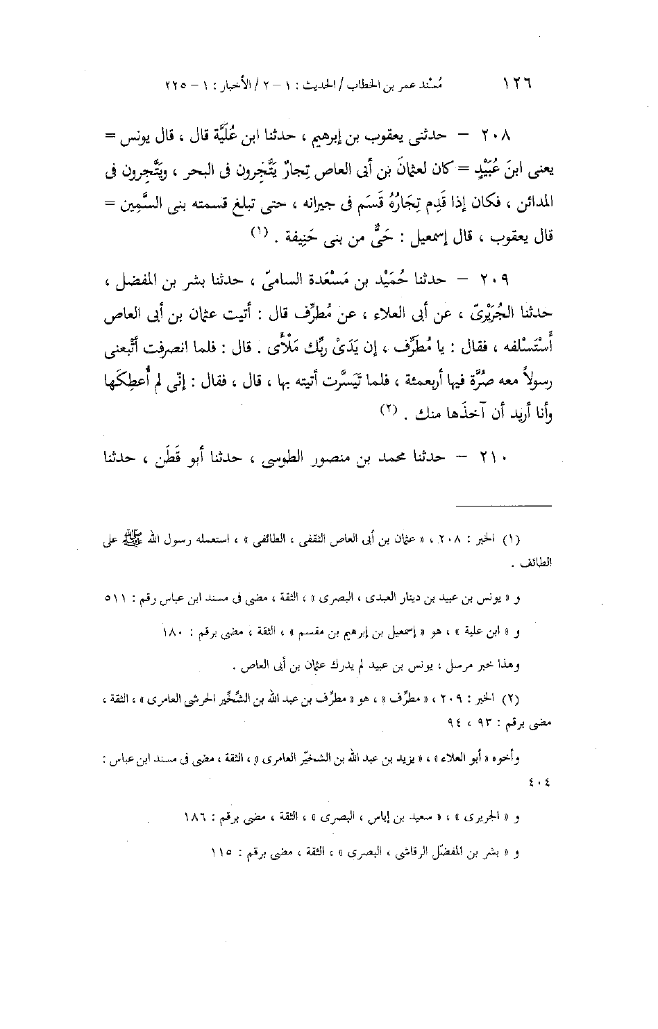 209 - حَدَّثَنَا حُمَيْدُ بْنُ مَسْعَدَةَ السَّامِيُّ، حَدَّثَنَا بِشْرُ بْنُ الْمُفَضَّلِ، حَدَّثَنَا الْجُرَيْرِيُّ، عَنْ أَبِي الْعَلَاءِ، عَنْ مُطَرِّفٍ، قَالَ: أَتَيْتُ عُثْمَانَ بْنَ أَبِي الْعَاصِ أسْتَسْلِفُهُ، فَقَالَ: " يَا مُطَرِّفُ، إِنَّ §يَدَيْ رَبِّكَ مَلْأَى. قَالَ: فَلَمَّا انْصَرَفْتُ أَتْبَعَنِي رَسُولًا مَعَهُ صُرَّةٌ فِيهَا أَرْبَعُمِائَةٍ، فَلَمَّا تَيَسَّرْتُ أَتَيْتُهُ بِهَا. قَالَ: فَقَالَ: إِنِّي لَمْ أُعْطِكَهَا وَأَنَا أُرِيدُ أَنْ آخُذَهَا مِنْكَ "