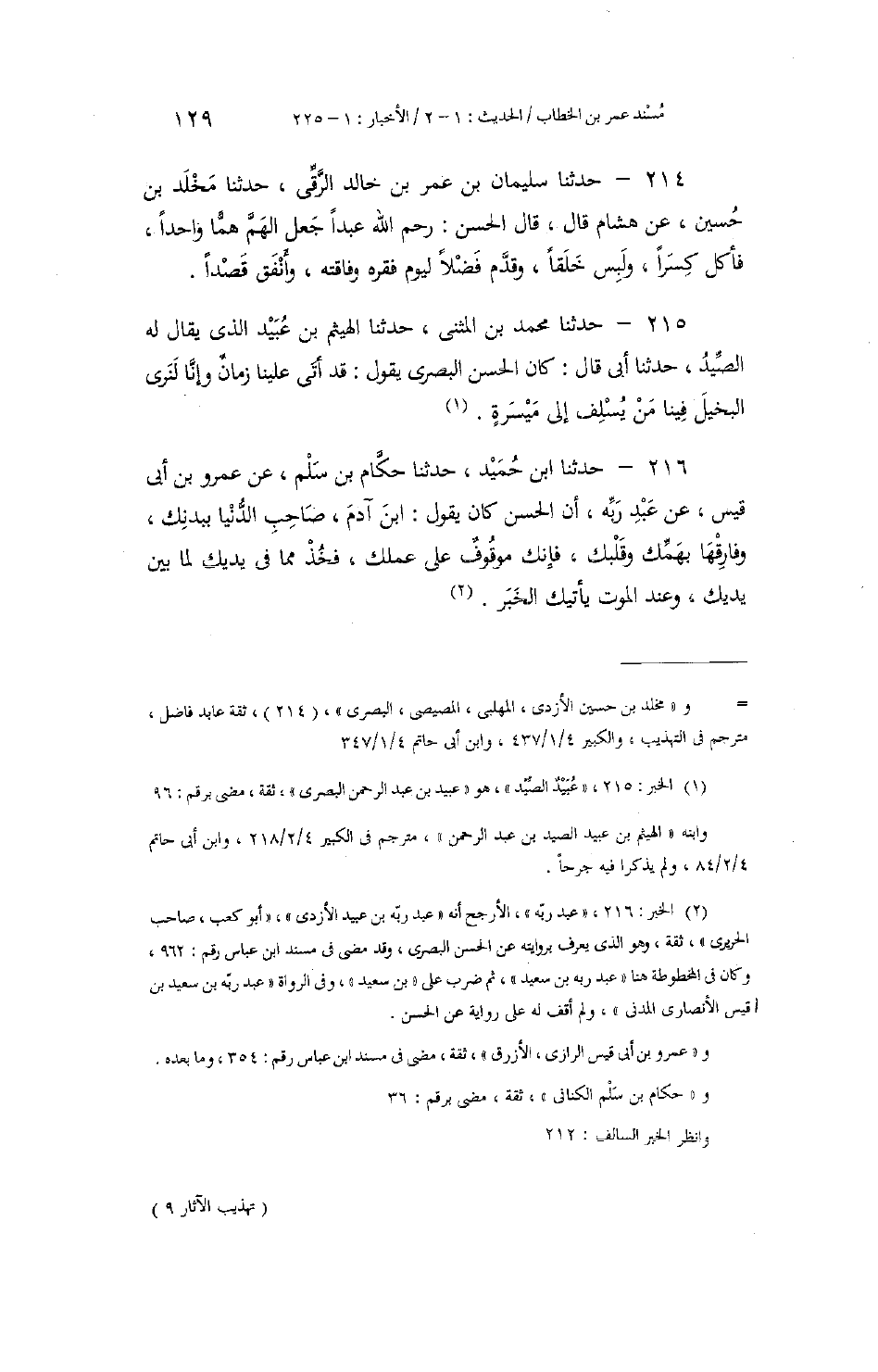 215 - حَدَّثَنَا مُحَمَّدُ بْنُ الْمُثَنَّى، حَدَّثَنَا الْهَيْثَمُ بْنُ عُبَيْدٍ، الَّذِي يُقَالَ لَهُ الصِّيدُ -، حَدَّثَنَا أَبِي، قَالَ: كَانَ الْحَسَنُ الْبَصْرِيُّ، يَقُولُ: «§قَدْ أَتَى عَلَيْنَا زَمَانٌ، وَإِنَّا لَنَرَى الْبَخِيلَ فِينَا مَنْ يُسَلِّفُ إِلَى مَيْسَرَةٍ»