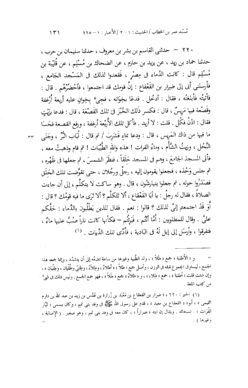 220 - حَدَّثَنِي الْقَاسِمُ بْنُ بِشْرِ بْنِ مَعْرُوفٍ، حَدَّثَنَا سُلَيْمَانُ بْنُ حَرْبٍ، حَدَّثَنَا حَمَّادُ بْنُ زَيْدٍ، عَنْ يَزِيدَ بْنِ حَازِمٍ، عَنِ الضَّحَّاكِ بْنِ مُسْلِمٍ، عَنْ قُتَيْبَةَ بْنِ مُسْلِمٍ، قَالَ: " كَانَتِ §الدِّمَاءُ فِي مِصْرٍ، فَقَعَدُوا لِذَلِكَ فِي الْمَسْجِدِ الْجَامِعِ، فَأَرْسَلَنِي أَبِي إِلَى ضِرَارِ بْنِ الْقَعْقَاعِ: إِنَّ قَوْمَكَ قَدِ اجْتَمَعُوا، فَاحْضُرْهُمْ. قَالَ: فَأَتَيْتُهُ فَأَبْلَغْتُهُ، فَقَالَ: ادْخُلْ. فَدَعَا بِخِوَانِهِ، فَجِيءَ بِخِوَانٍ عَلَيْهِ أَرْبَعَةُ أَرْغِفَةٍ، وَقَصْعَةٍ فِيهَا مَرِيسٌ، قَالَ: فَكَسَّرَ ذَلِكَ الْخُبْزَ فِي تِلْكَ الْقَصْعَةِ، قَالَ: فَدَعَا بِزَيْتٍ , فَقَالَ: ادْنُ فَكُلْ. قُلْتُ: لَا أُرِيدُ. فَأَكَلَ تِلْكَ الْأَرْبَعَةَ أَرْغِفَةٍ، وَرَفَعَ الْقَصْعَةَ فَحَسَا مَا فِيهَا مِنْ ذَاكَ الْمَرِيسِ، قَالَ: وَدَعَا بِمَاءٍ فَشَرِبَ، ثُمَّ قَالَ: لُبَابُ الْبُرِّ، وَجَنَى النَّحْلِ، وَزَيْتُ الشَّأْمِ، وَمَاءُ الْفُرَاتِ، هَذِهِ - وَاللَّهِ - الطَّيِّبَاتُ ثُمَّ قَامَ وَذَهَبْتُ مَعَهُ، فَأَتَى الْمَسْجِدَ الْجَامِعَ، وَهُمْ فِي الْمَسْجِدِ حِلَقًا، فَنَظَرَ الشَّمْسَ، ثُمَّ جَعَلَهَا فِي ظَهْرِهِ، ثُمَّ جَلَسَ وَحْدَهُ، فَجَعَلُوا يَقُومُونَ إِلَيْهِ، رَجُلٌ وَرَجُلَانِ، حَتَّى تَقَوَّضَتْ تِلْكَ الْحِلَقُ فَصَدَرُوا حَوْلَهُ، ثُمَّ جَعَلُوا يَتَهَارَشُونَ. قَالَ: وَهُوَ سَاكِتٌ لَا يَتَكَلَّمُ، إِلَى أَنْ جَاءَتِ الصَّلَاةُ، فَقَالَ لَهُ رَجُلٌ: يَا أَبَا الْقَعْقَاعِ، أَلَا تَتَكَلَّمُ؟ أَلَا تَرَى مَا فِيهِ قَوْمُكَ؟ قَالَ: أَوَ قَدِ اجْتَمَعْتُمْ إِلَيَّ لِذَلِكَ؟ قَالُوا: نَعَمْ. فَقَالَ لِلَّذِينَ يَطْلُبُونَ بِالدِّمَاءِ: حَقُّكُمْ عَلَيَّ. وَقَالَ لِلْمَطْلُوبِينَ: أَمَّا أَنْتُمْ، فَبَرِئْتُمْ. فَكَأَنَّهَا كَانَتْ نَارًا صُبَّ عَلَيْهَا مَاءٌ، فَتَفَرَّقُوا، وَأَرْسَلَ إِلَى إِبِلٍ لَهُ فِي الْبَادِيَةِ، فَأَدَّى تِلْكَ الدِّيَاتِ