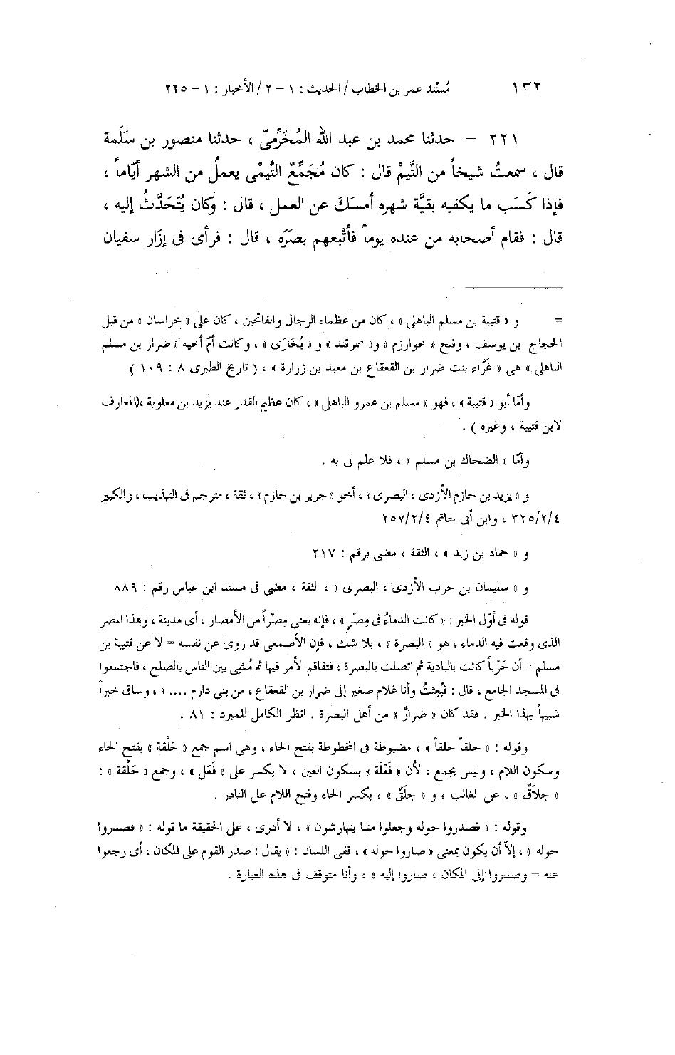221 - حَدَّثَنَا مُحَمَّدُ بْنُ عَبْدِ اللَّهِ الْمُخَرِّمِيُّ، حَدَّثَنَا مَنْصُورُ بْنُ سَلَمَةَ، قَالَ: سَمِعْتُ شَيْخًا، مِنَ التَّيْمِ قَالَ: كَانَ مُجَمِّعٌ التَّيْمِيُّ §يَعْمَلُ مِنَ الشَّهْرِ أَيَّامًا، فَإِذَا كَسَبَ مَا يَكْفِيهِ بَقِيَّةَ شَهْرِهِ أَمْسَكَ عَنِ الْعَمَلِ. قَالَ: وَكَانَ يُتَحَدَّثُ إِلَيْهِ، قَالَ: فَقَامَ أَصْحَابُهُ مِنْ عِنْدِهِ يَوْمًا فَأَتْبَعَهُمْ بَصَرَهُ، قَالَ: فَرَأَى فِي إِزَارِ سُفْيَانَ -[133]- بِلًى أَوْ خَرْقًا أَوْ رِقَاعًا. قَالَ: فَسَأَلَهُ أَنْ يَرْجِعَ إِلَيْهِ، فَرَجَعَ إِلَيْهِ سُفْيَانُ. قَالَ: فَضَرَبَ بِيَدِهِ إِلَى بَارِيَّةٍ كَانَ عَلَيْهَا. قَالَ: فَأَخْرَجَ خَمْسَةَ دَارِهِمَ كَانَتْ تَحْتَهَا، ثُمَّ أَقْبَلَ عَلَى سُفْيَانَ، فَقَالَ: يَا أَبَا عَبْدِ اللَّهِ ابْتَعْ بِهَذِهِ إِزَارًا. قَالَ: فَقَالَ لَهُ سُفْيَانُ: إِنَّ هَذَا عَنْ غَيْرِ حَاجَةٍ. قَالَ: فَقَالَ لَهُ مُجَمِّعٌ: فَإِنِّي أَسْأَلُكَ - يَعْنِي: لَمَا قَبِلْتَهَا - فَجَعَلَ سُفْيَانُ يَأْبَى، وَجَعَلَ مُجَمِّعٌ يَسْأَلُهُ قَبُولَهَا. قَالَ: فَجَعَلْنَا نَعْجَبُ مِنْ رَجُلٍ لَا يَمْلِكُ إِلَّا خَمْسَةَ دَرَاهِمَ مِنْ عَمَلِ يَدِهِ بَذَلَهَا