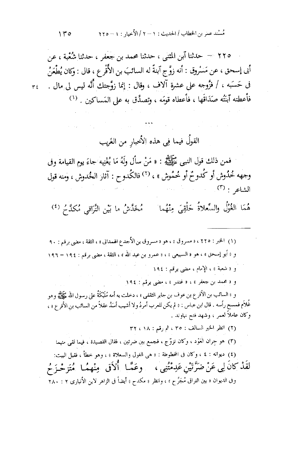 225 - حَدَّثَنَا ابْنُ الْمُثَنَّى، حَدَّثَنَا مُحَمَّدُ بْنُ جَعْفَرٍ، حَدَّثَنَا شُعْبَةُ، عَنْ أَبِي إِسْحَاقَ، عَنْ مَسْرُوقٍ، أَنَّهُ زَوَّجَ ابْنَةً لَهُ السَّائِبَ بْنَ الْأَقْرَعِ. قَالَ: وَكَانَ يُطْعَنُ فِي حَسَبِهِ، فَزَوَّجَهُ عَلَى عَشَرَةِ آلَافٍ، وَقَالَ: «§إِنَّمَا زَوَّجْتُكِ أَنَّهُ لَيْسَ لِي مَالٌ» فَأَعْطَتْهُ ابْنَتُهُ صَدَاقَهَا، فَأَعْطَاهُ قَوْمَهُ، وَتَصَدَّقَ بِهِ عَلَى الْمَسَاكِينِ