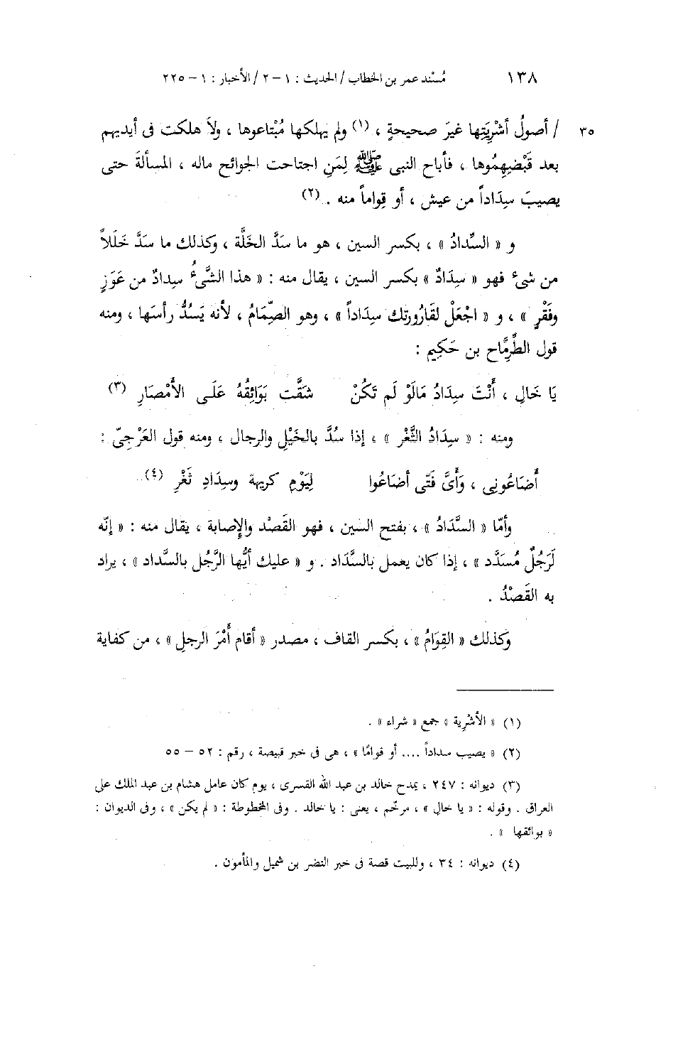 وَأَمَّا السَّدَادَ بِفَتْحِ السِّينِ: فَهُوَ الْقَصْدُ وَالْإِصَابَةُ، يُقَالُ مِنْهُ: إِنَّهُ لَرَجُلٌ مُسَدَّدٌ، إِذَا كَانَ يَعْمَلُ بِالسَّدَادِ. وَعَلَيْكَ أَيُّهَا الرَّجُلُ بِالسَّدَادِ، يُرَادُ بِهِ الْقَصْدُ. وَكَذَلِكَ الْقِوَامُ بِكَسْرِ الْقَافِ: مَصْدَرُ أَقَامَ أَمْرَ الرَّجُلِ، مِنْ كِفَايَةٍ