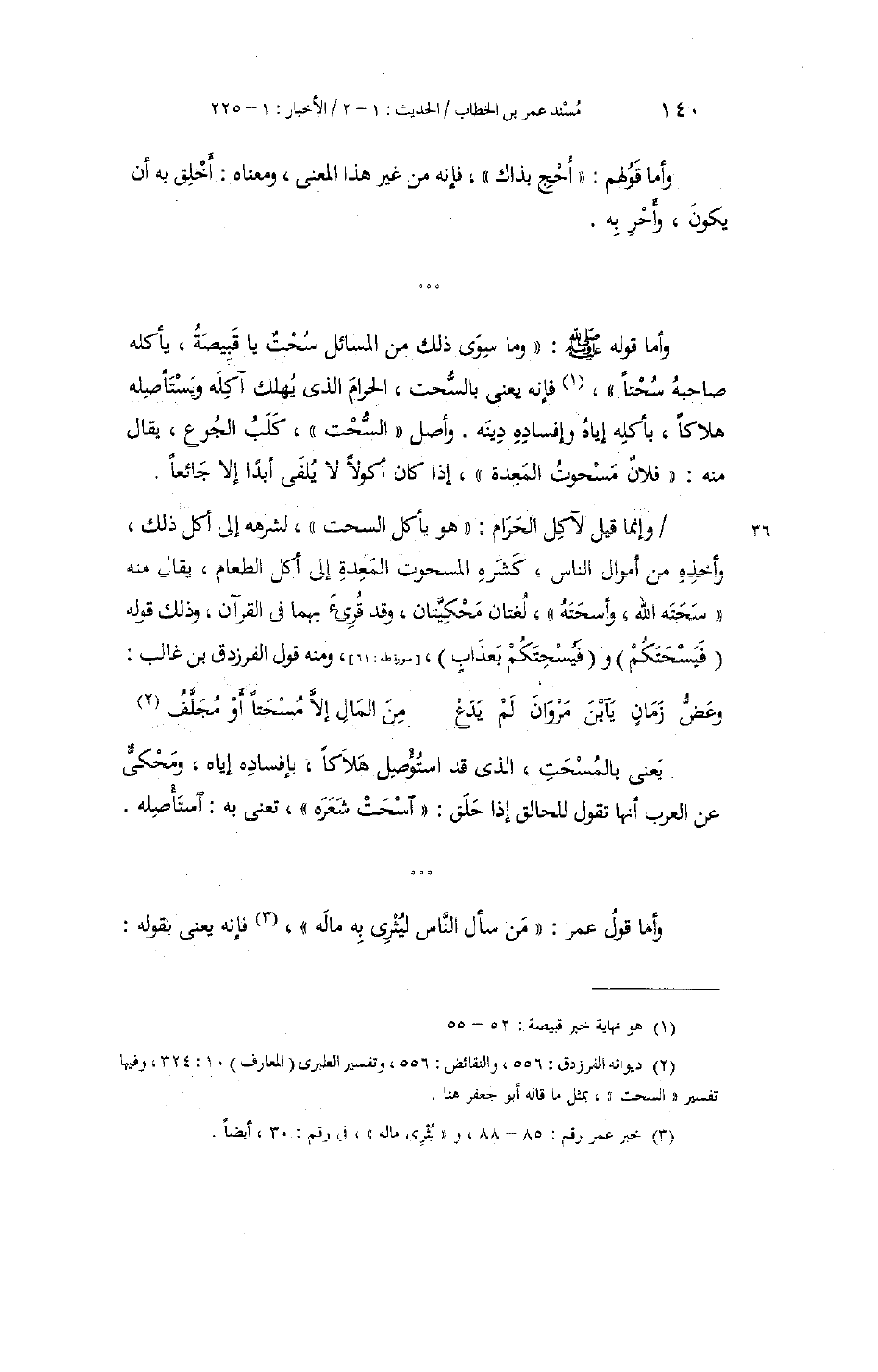 وَأَمَّا قَوْلُهُمْ: أَحْجِ بِذَاكَ، فَإِنَّهُ مِنْ غَيْرِ هَذَا الْمَعْنَى، وَمَعْنَاهُ: أَخْلِقْ بِهِ أَنْ يَكُونَ، وَأَحْرِ بِهِ. وَأَمَّا قَوْلُهُ صَلَّى اللهُ عَلَيْهِ وَسَلَّمَ: «وَمَا سِوَى ذَلِكَ مِنَ الْمَسَائِلِ سُحْتٌ يَا قَبِيصَةُ، يَأْكُلُهُ صَاحِبُهُ سُحْتًا» ، فَإِنَّهُ يَعْنِي بِالسُّحْتِ: الْحَرَامَ الَّذِي يُهْلِكُ آكِلَهُ وَيَسْتَأْصِلُهُ هَلَاكًا، بِأَكْلِهِ إِيَّاهُ وَإِفْسَادِهِ دِينَهُ. وَأَصْلُ السُّحْتِ: كَلْبُ الْجُوعِ، يُقَالُ مِنْهُ: فُلَانٌ مَسْحُوتُ الْمَعِدَةِ، إِذَا كَانَ أَكُولًا لَا يُلْفَى أَبَدًا إِلَّا جَائِعًا. وَإِنَّمَا قِيلَ لِآكِلِ الْحَرَامِ: هُوَ يَأْكُلُ السُّحْتَ؛ لِشَرَهِهِ إِلَى أَكْلِ ذَلِكَ، وَأَخْذِهِ مِنْ أَمْوَالِ النَّاسِ، كَشَرَهِ الْمَسْحُوتِ الْمَعِدَةِ إِلَى أَكْلِ الطَّعَامِ، يُقَالُ مِنْهُ: سَحَتَهُ اللَّهُ، وَأَسْحَتَهُ، لُغَتَانِ مَحْكِيَّتَانِ، وَقَدْ قُرِئَ بِهِمَا فِي الْقُرْآنِ، وَذَلِكَ قَوْلُهُ (فَيَسْحَتَكُمْ) وَ {فَيُسْحِتَكُمْ بِعَذَابٍ} [طه: 61] ، وَمِنْهُ قَوْلُ الْفَرَزْدَقِ بْنِ غَالِبٍ:
