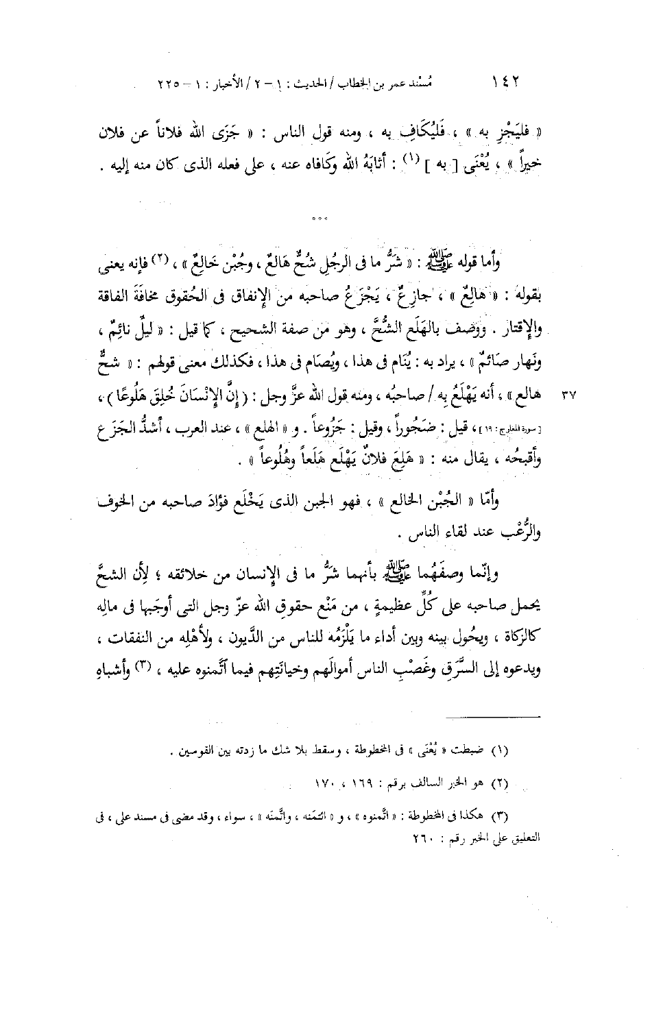 : «فَلْيَجْزِ بِهِ» : فَلْيُكَافِ بِهِ، وَمِنْهُ قَوْلُ النَّاسِ: جَزَى اللَّهُ فُلَانًا عَنْ فُلَانٍ خَيْرًا، يُعْنَى بِهِ: أَثَابَهُ اللَّهُ وَكَافَاهُ عَنْهُ، عَلَى فِعْلِهِ الَّذِي كَانَ مِنْهُ إِلَيْهِ. وَأَمَّا قَوْلُهُ صَلَّى اللهُ عَلَيْهِ وَسَلَّمَ: «شَرُّ مَا فِي الرَّجُلِ شُحٌّ هَالِعٌ، وَجُبْنٌ خَالِعٌ» ، فَإِنَّهُ يَعْنِي بِقَوْلِهِ: «هَالِعٌ» : جَازِعٌ، يَجْزَعُ صَاحِبُهُ مِنَ الْإِنْفَاقِ فِي الْحُقُوقِ مَخَافَةَ الْفَاقَةِ وَالْإِقْتَارِ. وَوَصَفَ بِالْهَلَعِ الشُّحَّ - وَهُوَ مِنْ صِفَةِ الشَّحِيحِ - كَمَا قِيلَ: لَيْلٌ نَائِمٌ، وَنَهَارٌ صَائِمٌ، يُرَادُ بِهِ: يُنَامُ فِي هَذَا، وَيُصَامُ فِي هَذَا، فَكَذَلِكَ مَعْنَى قَوْلِهِمْ: شُحٌّ هَالِعٌ، أَنَّهُ يَهْلَعُ بِهِ صَاحِبُهُ، وَمِنْهُ قَوْلُ اللَّهِ عَزَّ وَجَلَّ: {إِنَّ الْإِنْسَانَ خُلِقَ هَلُوعًا} [المعارج: 19] ، قِيلَ: ضَجُورًا، وَقِيلَ: جَزُوعًا. وَالْهَلَعُ عِنْدَ الْعَرَبِ: أَشَدُّ الْجَزَعِ وَأَقْبَحُهُ، يُقَالُ مِنْهُ: هَلِعَ فُلَانٌ يَهْلَعُ هَلَعًا وَهُلُوعًا. وَأَمَّا الْجُبْنُ الْخَالِعُ: فَهُوَ الْجُبْنُ الَّذِي يَخْلَعَ فُؤَادَ صَاحِبِهِ مِنَ الْخَوْفِ وَالرُّعْبِ عِنْدَ لِقَاءِ النَّاسِ. وَإِنَّمَا وَصَفَهُمَا صَلَّى اللهُ عَلَيْهِ وَسَلَّمَ بِأَنَّهُمَا شَرُّ مَا فِي الْإِنْسَانِ مِنْ خَلَائِقِهِ؛ لِأَنَّ الشُّحَّ يَحْمِلُ صَاحِبَهُ عَلَى كُلِّ عَظِيمَةٍ، مِنْ مَنْعِ حُقُوقِ اللَّهِ عَزَّ وَجَلَّ الَّتِي أَوْجَبَهَا فِي مَالِهِ كَالزَّكَاةِ، وَيَحُولُ بَيْنَهُ وَبَيْنَ أَدَاءِ مَا يَلْزَمُهُ لِلنَّاسِ مِنَ الدُّيُونِ، وَلِأَهْلِهِ مِنَ النَّفَقَاتِ، وَيَدْعُوهُ إِلَى السَّرَقِ وَغَصْبِ النَّاسِ أَمْوَالَهُمْ، وَخِيَانَتِهِمْ فِيمَا اتَّمَنُوهُ عَلَيْهِ، وَأَشْبَاهِ
