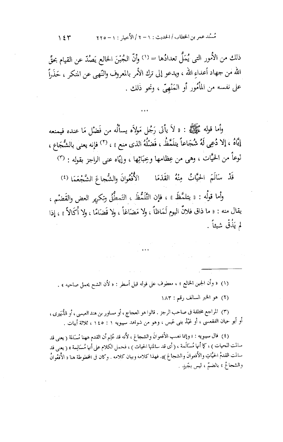 ذَلِكَ مِنَ الْأُمُورِ الَّتِي يُمَلُّ تَعْدَادُهَا، وَأَنَّ الْجُبْنَ الْخَالِعَ يَصُدُّ عَنِ الْقِيَامِ بِحَقِّ اللَّهِ مِنْ جِهَادِ أَعْدَاءِ اللَّهِ، وَيَدْعُو إِلَى تَرْكِ الْأَمْرِ بِالْمَعْرُوفِ وَالنَّهْيِ عَنِ الْمُنْكَرِ، حَذَرًا عَلَى نَفْسِهِ مِنَ الْمَأْمُورِ أَوِ الْمَنْهِيِّ، وَنَحْوِ ذَلِكَ. وَأَمَّا قَوْلُهُ صَلَّى اللهُ عَلَيْهِ وَسَلَّمَ: «لَا يَأْتِي رَجُلٌ مَوْلَاهُ يَسْأَلُهُ مِنْ فَضْلِ مَا عِنْدَهُ فَيَمْنَعُهُ إِيَّاهُ، إِلَّا دُعِيَ لَهُ شُجَاعًا يَتَلَمَّظُ، فَضْلُهُ الَّذِي مَنَعَ» ، فَإِنَّهُ يَعْنِي بِالشُّجَاعِ: نَوْعًا مِنَ الْحَيَّاتِ، وَهِيَ مِنْ عِظَامِهَا وَخِبَاثِهَا، وَإِيَّاهُ عَنَى الرَّاجِزُ بِقَوْلِهِ: