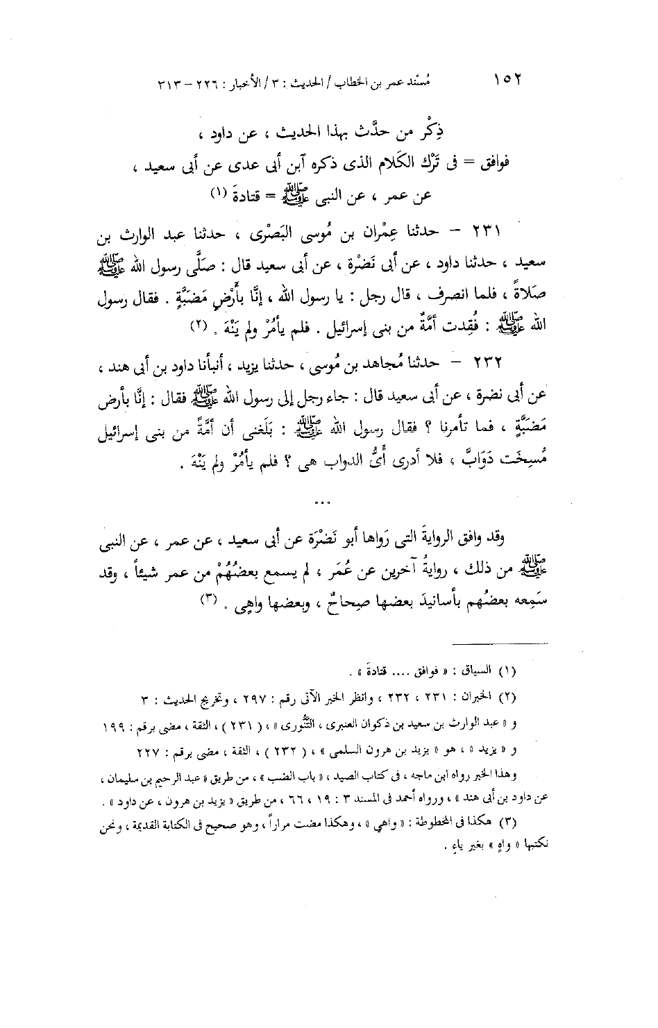 232 - حَدَّثَنَا مُجَاهِدُ بْنُ مُوسَى، حَدَّثَنَا يَزِيدُ، أَنْبَأَنَا دَاوُدُ بْنُ أَبِي هِنْدَ، عَنْ أَبِي نَضْرَةَ، عَنْ أَبِي سَعِيدٍ، قَالَ: جَاءَ رَجُلٌ إِلَى رَسُولِ اللَّهِ صَلَّى اللهُ عَلَيْهِ وَسَلَّمَ فَقَالَ: إِنَّا بِأَرْضٍ مَضَبَّةٍ، فَمَا تَأْمُرُنَا؟ فَقَالَ رَسُولُ اللَّهِ صَلَّى اللهُ عَلَيْهِ وَسَلَّمَ: «§بَلَغَنِي أَنَّ أُمَّةً مِنْ بَنِي إِسْرَائِيلَ مُسِخَتْ دَوَابَّ، فَلَا أَدْرِي أَيُّ الدَّوَابِّ هِيَ؟» فَلَمْ يَأْمُرْ وَلَمْ يَنْهَ وَقَدْ وَافَقَ الرِّوَايَةَ الَّتِي رَوَاهَا أَبُو نَضْرَةَ عَنْ أَبِي سَعِيدٍ، عَنْ عُمَرَ، عَنِ النَّبِيِّ صَلَّى اللهُ عَلَيْهِ وَسَلَّمَ مِنْ ذَلِكَ، رِوَايَةُ آخَرِينَ عَنْ عُمَرَ، لَمْ يَسْمَعْ بَعْضُهُمْ مِنْ عُمَرَ شَيْئًا، وَقَدْ سَمِعَهُ بَعْضُهُمْ بِأَسَانِيدَ بَعْضُهَا صِحَاحٌ، وَبَعْضُهَا وَاهٍ