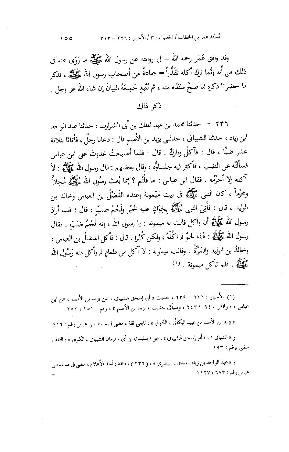 236 - حَدَّثَنَا مُحَمَّدُ بْنُ عَبْدِ الْمَلِكِ بْنِ أَبِي الشَّوَارِبِ، حَدَّثَنَا عَبْدُ الْوَاحِدِ بْنُ زِيَادٍ، حَدَّثَنَا الشَّيْبَانِيُّ، حَدَّثَنِي يَزِيدُ بْنُ الْأَصَمِّ، قَالَ: دَعَانَا رَجُلٌ، فَأَتَانَا بِثَلَاثَةَ عَشَرَ ضَبًّا. قَالَ: فَآكِلٌ وَتَارِكٌ. قَالَ: فَلَمَّا أَصْبَحْتُ غَدَوْتُ عَلَى ابْنِ عَبَّاسٍ فَسَأَلْتُهُ عَنِ الضَّبِّ، فَأَكْثَرَ فِيهِ جُلَسَاؤُهُ، وَقَالَ بَعْضُهُمْ: قَالَ رَسُولُ اللَّهِ صَلَّى اللهُ عَلَيْهِ وَسَلَّمَ: «لَا آكُلُهُ وَلَا أُحَرِّمُهُ» فَقَالَ ابْنُ عَبَّاسٍ: مَا قُلْتُمْ؟ إِنَّمَا بُعِثَ رَسُولُ اللَّهِ صَلَّى اللهُ عَلَيْهِ وَسَلَّمَ مُحِلًّا وَمُحَرِّمًا، كَانَ النَّبِيُّ صَلَّى اللهُ عَلَيْهِ وَسَلَّمَ فِي بَيْتِ مَيْمُونَةَ وَعِنْدَهُ الْفَضْلُ بْنُ الْعَبَّاسِ وَخَالِدُ بْنُ الْوَلِيدِ. قَالَ: فَأُتِيَ النَّبِيُّ صَلَّى اللهُ عَلَيْهِ وَسَلَّمَ بِخِوَانٍ عَلَيْهِ خُبْزٌ وَلَحْمُ ضَبٍّ. قَالَ: فَلَمَّا أَرَادَ رَسُولُ اللَّهِ صَلَّى اللهُ عَلَيْهِ وَسَلَّمَ أَنْ يَأْكُلَ قَالَتْ لَهُ مَيْمُونَةُ: يَا رَسُولَ اللَّهِ، إِنَّهُ لَحْمُ ضَبٍّ. فَقَالَ رَسُولُ اللَّهِ صَلَّى اللهُ عَلَيْهِ وَسَلَّمَ: «§هَذَا لَحْمٌ لَمْ آكُلْهُ، وَلَكِنْ كُلُوا» . قَالَ: فَأَكَلَ الْفَضْلُ بْنُ الْعَبَّاسِ، وَخَالِدُ بْنُ الْوَلِيدِ وَالْمَرْأَةُ، وَقَالَتْ مَيْمُونَةُ: لَا آكُلُ مِنْ طَعَامٍ لَمْ يَأْكُلْ مِنْهُ رَسُولُ اللَّهِ صَلَّى اللهُ عَلَيْهِ وَسَلَّمَ. فَلَمْ تَأْكُلْ مَيْمُونَةُ
