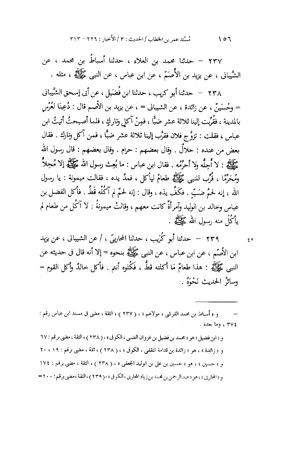 238 - حَدَّثَنَا أَبُو كُرَيْبٍ، حَدَّثَنَا ابْنُ فُضَيْلٍ، عَنْ أَبِي إِسْحَاقَ الشَّيْبَانِيِّ، وَحُسَيْنٌ، عَنْ زَائِدَةَ، عَنِ الشَّيْبَانِيِّ، عَنْ يَزِيدَ بْنِ الْأَصَمِّ، قَالَ: دُعِينَا لِعُرْسٍ بِالْمَدِينَةِ، فَقُرِّبَتْ إِلَيْنَا ثَلَاثَةَ عَشَرَ ضَبًّا، فَمِنْ آكِلٍ وَتَارِكٍ، فَلَمَّا أَصْبَحْتُ أَتَيْتُ ابْنَ عَبَّاسٍ، فَقُلْتُ: تَزَوَّجَ فُلَانٌ فَقَرَّبَ إِلَيْنَا ثَلَاثَةَ عَشَرَ ضَبًّا، فَمِنْ آكِلٍ وَتَارِكٍ. فَقَالَ بَعْضُ مَنْ عِنْدَهُ: حَلَالٌ. وَقَالَ بَعْضُهُمْ: حَرَامٌ. وَقَالَ بَعْضُهُمْ: قَالَ رَسُولُ اللَّهِ صَلَّى اللهُ عَلَيْهِ وَسَلَّمَ: لَا أُحِلُّهُ وَلَا أُحَرِّمُهُ ". فَقَالَ ابْنُ عَبَّاسٍ: مَا بُعِثَ رَسُولُ اللَّهِ صَلَّى اللهُ عَلَيْهِ وَسَلَّمَ إِلَّا مُحِلًّا وَمُحَرِّمًا، قُرِّبَ لِلنَّبِيِّ صَلَّى اللهُ عَلَيْهِ وَسَلَّمَ طَعَامٌ لِيَأْكُلَ، فَمَدَّ يَدَهُ، فَقَالَتْ مَيْمُونَةُ: يَا رَسُولَ اللَّهِ، إِنَّهُ لَحْمُ ضَبٍّ؛ فَكَفَّ يَدَهُ، وَقَالَ: «§إِنَّهُ لَحْمٌ لَمْ آكُلْهُ قَطُّ» . فَأَكَلَ الْفَضْلُ بْنُ عَبَّاسٍ وَخَالِدُ بْنُ الْوَلِيدِ وَامْرَأَةٌ كَانَتْ مَعَهُمْ، وَقَالَتْ مَيْمُونَةُ: لَا آكُلُ مِنْ طَعَامٍ لَمْ يَأْكُلْ مِنْهُ رَسُولُ اللَّهِ صَلَّى اللهُ عَلَيْهِ وَسَلَّمَ،