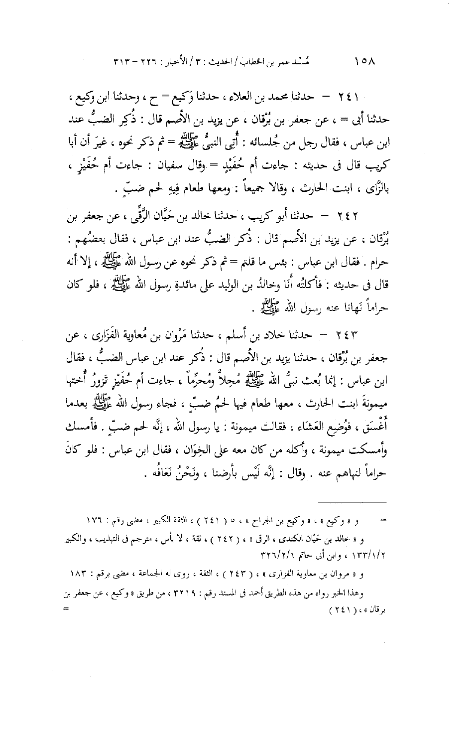 243 - حَدَّثَنَا خَلَّادُ بْنُ أَسْلَمَ، حَدَّثَنَا مَرْوَانُ بْنُ مُعَاوِيَةَ الْفَزَارِيُّ، عَنْ جَعْفَرِ بْنِ بُرْقَانَ، حَدَّثَنَا يَزِيدُ بْنُ الْأَصَمِّ، قَالَ: ذُكِرَ عِنْدَ ابْنِ عَبَّاسٍ الضَّبُّ، فَقَالَ ابْنُ عَبَّاسٍ: إِنَّمَا بُعِثَ نَبِيُّ اللَّهِ صَلَّى اللهُ عَلَيْهِ وَسَلَّمَ مُحِلًّا وَمُحَرِّمًا، جَاءَتْ أُمُّ حُفَيْزٍ تَزُورُ أُخْتَهَا مَيْمُونَةَ بْنَتَ الْحَارِثِ، مَعَهَا طَعَامٌ فِيهَا لَحْمُ ضَبٍّ، فَجَاءَ رَسُولُ اللَّهِ صَلَّى اللهُ عَلَيْهِ وَسَلَّمَ بَعْدَمَا أَغْسَقَ، فَوُضِعَ الْعَشَاءُ، فَقَالَتْ مَيْمُونَةُ: يَا رَسُولَ اللَّهِ، إِنَّهُ لَحْمُ ضَبٍّ؛ فَأَمْسَكَ وَأَمْسَكَتْ مَيْمُونَةُ، وَأَكَلَهُ مَنْ كَانَ مَعَهُ عَلَى الْخِوَانِ، فَقَالَ ابْنُ عَبَّاسٍ: فَلَوْ كَانَ حَرَامًا لَنَهَاهُمْ عَنْهُ. وَقَالَ: «إِنَّهُ §لَيْسَ بِأَرْضِنَا، وَنَحْنُ نَعَافُهُ»