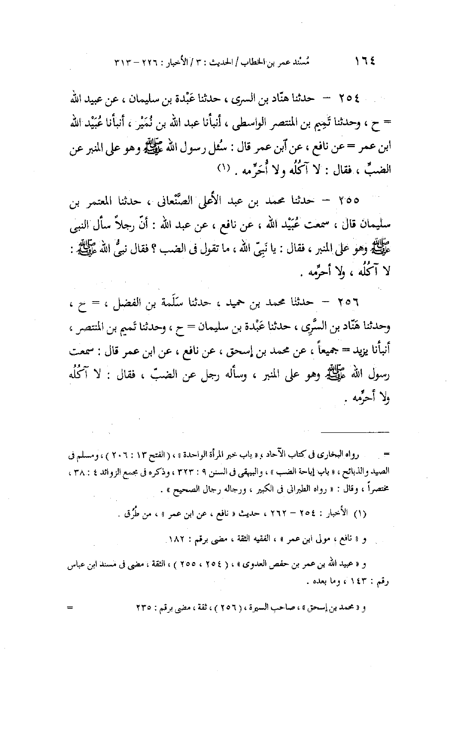 256 - حَدَّثَنَا مُحَمَّدُ بْنُ حُمَيْدٍ، حَدَّثَنَا سَلَمَةُ بْنُ الْفَضْلِ، ح، وَحَدَّثَنَا هَنَّادُ بْنُ السَّرِيِّ، حَدَّثَنَا عَبْدَةُ بْنُ سُلَيْمَانَ، (ح) وَحَدَّثَنَا تَمِيمُ بْنُ الْمُنْتَصِرِ، أَنْبَأَنَا يَزِيدُ جَمِيعًا عَنْ مُحَمَّدِ بْنِ إِسْحَاقَ، عَنْ نَافِعٍ، عَنِ ابْنِ عُمَرَ، قَالَ: سَمِعْتُ رَسُولَ اللَّهِ صَلَّى اللهُ عَلَيْهِ وَسَلَّمَ وَهُوَ عَلَى الْمِنْبَرِ، وَسَأَلَهُ رَجُلٌ عَنِ الضَّبِّ، فَقَالَ: «§لَا آكُلُهُ وَلَا أُحَرِّمُهُ»
