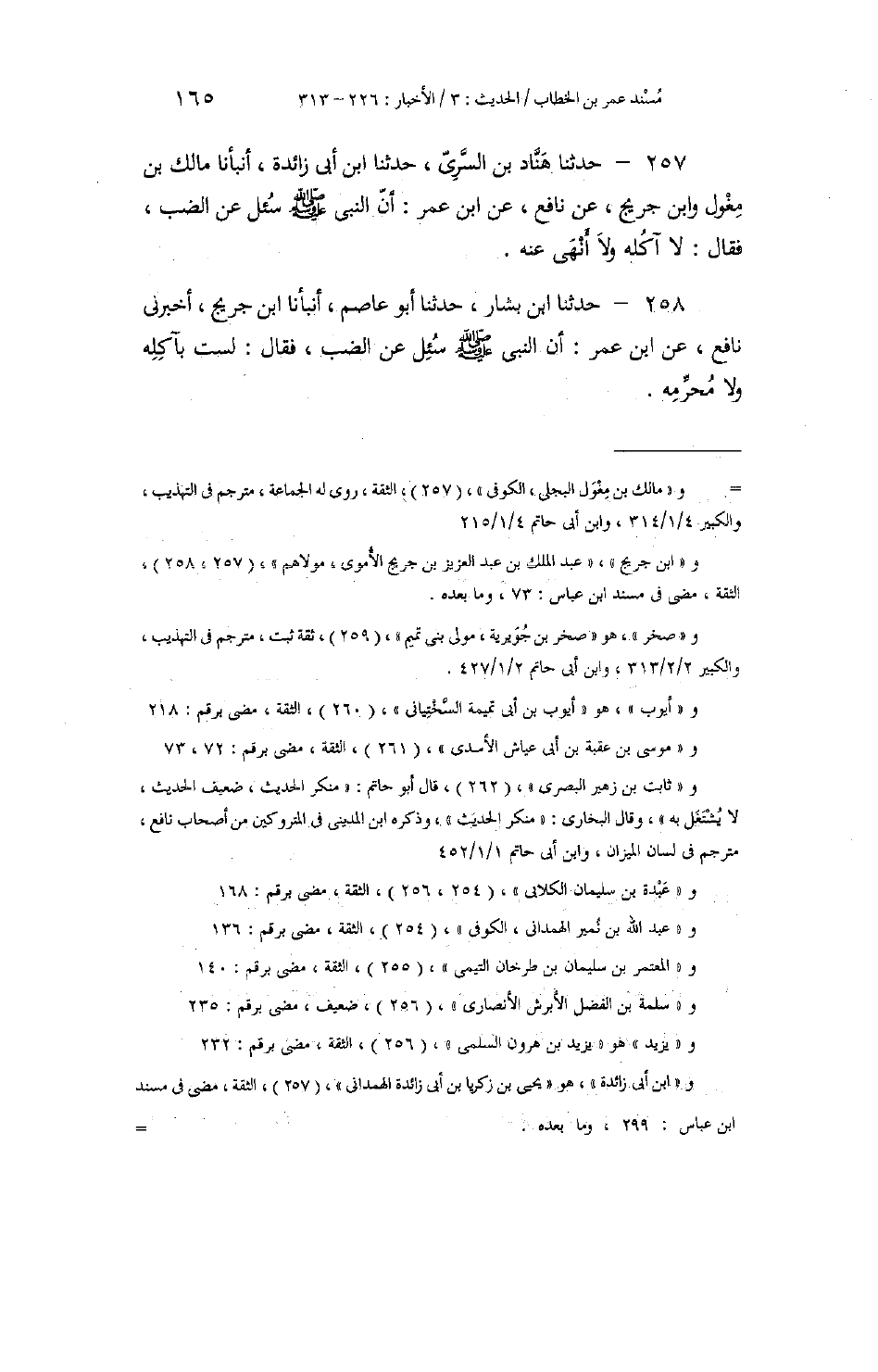 257 - حَدَّثَنَا هَنَّادُ بْنُ السَّرِيِّ، حَدَّثَنَا ابْنُ أَبِي زَائِدَةَ، أَنْبَأَنَا مَالِكُ بْنُ مِغْوَلٍ، وَابْنُ جُرَيْجٍ، عَنْ نَافِعٍ، عَنِ ابْنِ عُمَرَ، أَنَّ النَّبِيَّ صَلَّى اللهُ عَلَيْهِ وَسَلَّمَ سُئِلَ عَنِ الضَّبِّ، فَقَالَ: «§لَا آكُلُهُ وَلَا أَنْهَى عَنْهُ»