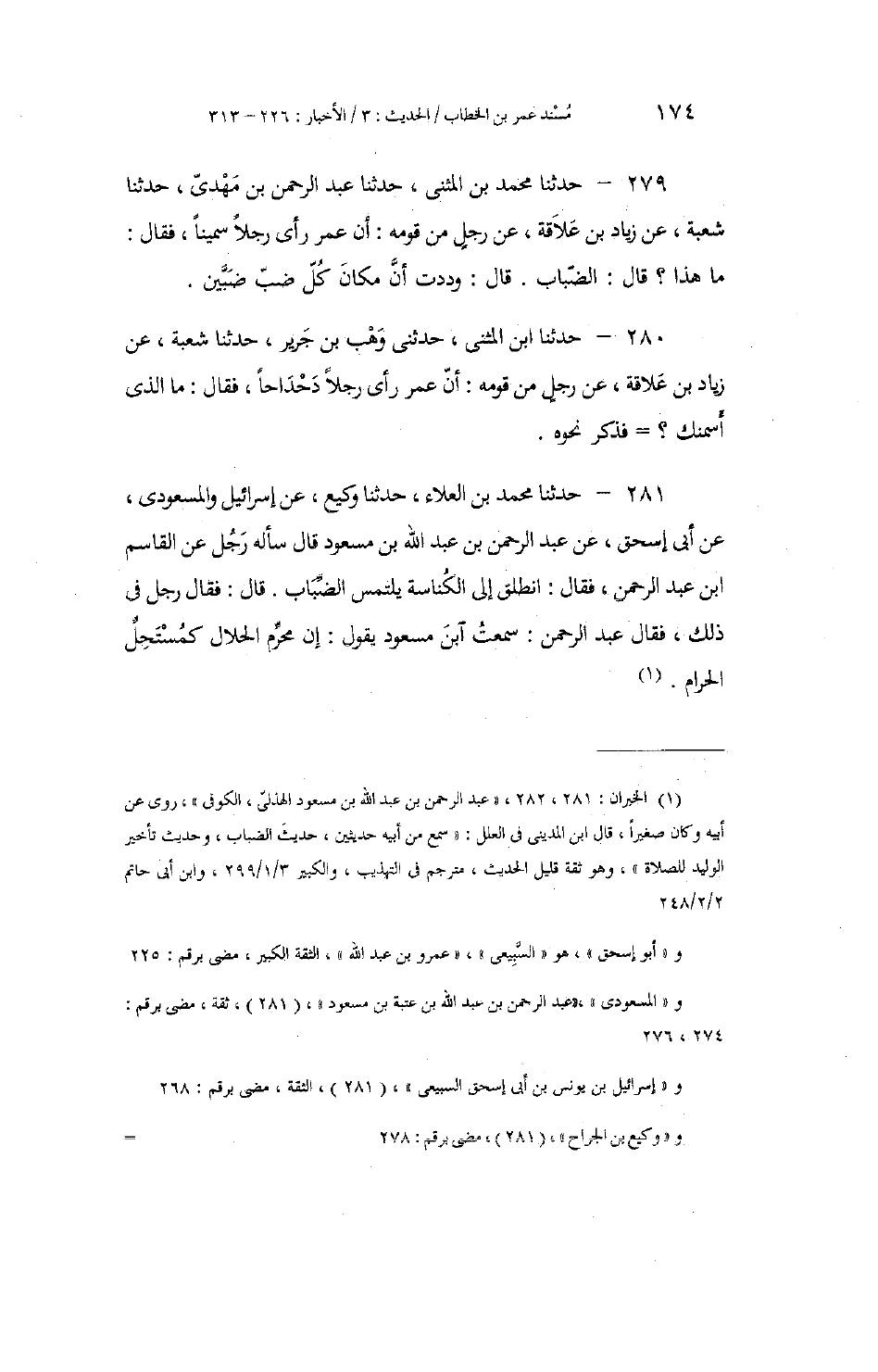 281 - حَدَّثَنَا مُحَمَّدُ بْنُ الْعَلَاءِ، حَدَّثَنَا وَكِيعٌ، عَنْ إِسْرَائِيلَ، وَالْمَسْعُودِيِّ، عَنْ أَبِي إِسْحَاقَ، عَنْ عَبْدِ الرَّحْمَنِ بْنِ عَبْدِ اللَّهِ بْنِ مَسْعُودٍ، قَالَ: سَأَلَهُ رَجُلٌ عَنِ الْقَاسِمِ بْنِ عَبْدِ الرَّحْمَنِ، فَقَالَ: انْطَلَقَ إِلَى الْكُنَاسَةِ يَلْتَمِسُ الضِّبَابَ. قَالَ: فَقَالَ رَجُلٌ فِي ذَلِكَ، فَقَالَ عَبْدُ الرَّحْمَنِ: سَمِعْتُ ابْنَ مَسْعُودٍ، يَقُولُ: «إِنَّ §مُحَرِّمَ الْحَلَالِ كَمُسْتَحِلِّ الْحَرَامِ»