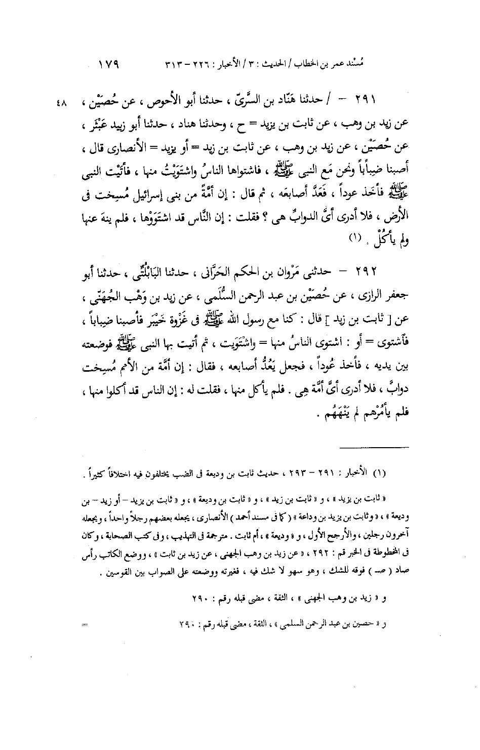 291 - حَدَّثَنَا هَنَّادُ بْنُ السَّرِيِّ، حَدَّثَنَا أَبُو الْأَحْوَصِ، عَنْ حُصَيْنٍ، عَنْ زَيْدِ بْنِ وَهْبٍ، عَنْ ثَابِتِ بْنِ يَزِيدَ ح، وَحَدَّثَنَا هَنَّادٌ، حَدَّثَنَا أَبُو زُبَيْدٍ عَبْثَرٌ، عَنْ حُصَيْنٍ، عَنْ زَيْدِ بْنِ وَهْبٍ، عَنْ ثَابِتِ بْنِ زَيْدٍ أَوْ يَزِيدَ الْأَنْصَارِيِّ قَالَ: أَصَبْنَا ضِبَابًا وَنَحْنُ مَعَ النَّبِيِّ صَلَّى اللهُ عَلَيْهِ وَسَلَّمَ، فَاشْتَوَاهَا النَّاسُ وَاشْتَوَيْتُ مِنْهَا، فَأَتَيْتُ النَّبِيَّ صَلَّى اللهُ عَلَيْهِ وَسَلَّمَ فَأَخَذَ عُودًا، فَعَدَّ أَصَابِعَهُ، ثُمَّ قَالَ: «إِنَّ §أُمَّةً مِنْ بَنِي إِسْرَائِيلَ مُسِخَتْ فِي الْأَرْضِ، فَلَا أَدْرِي أَيَّ الدَّوَابِّ هِيَ» . فَقُلْتُ: إِنَّ النَّاسَ قَدِ اشْتَوَوْهَا، فَلَمْ يَنْهَ عَنْهَا وَلَمْ يَأْكُلْ "
