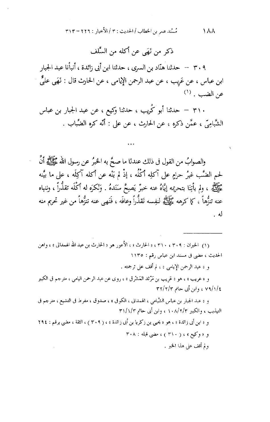 309 - حَدَّثَنَا هَنَّادُ بْنُ السَّرِيِّ، حَدَّثَنَا ابْنُ أَبِي زَائِدَةَ، أَنْبَأَنَا عَبْدُ الْجَبَّارِ بْنُ عَبَّاسٍ، عَنْ عَرِيبٍ، عَنْ عَبْدِ الرَّحْمَنِ الْيَامِيِّ، عَنِ الْحَارِثِ، قَالَ: «§نَهَى عَلِيٌّ عَنِ الضَّبِّ»