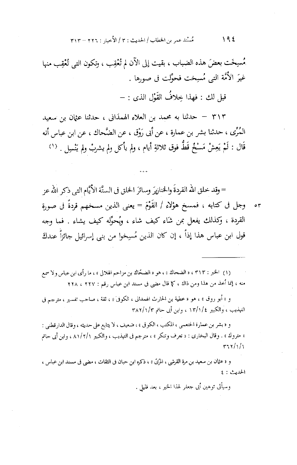 313 - حَدَّثَنَا بِهِ مُحَمَّدُ بْنُ الْعَلَاءِ الْهَمْدَانِيُّ، حَدَّثَنَا عُثْمَانُ بْنُ سَعِيدٍ الْمُرِّيُّ، حَدَّثَنَا بِشْرُ بْنُ عُمَارَةَ، عَنْ أَبِي رَوْقٍ، عَنِ الضَّحَّاكِ، عَنِ ابْنِ عَبَّاسٍ، أَنَّهُ قَالَ: «§لَمْ يَعِشْ مَسْخٌ قَطُّ فَوْقَ ثَلَاثَةِ أَيَّامٍ، وَلَمْ يَأْكُلْ، وَلَمْ يَشْرَبْ، وَلَمْ يَنْسِلْ» وَقَدْ خَلَقَ اللَّهُ الْقِرَدَةَ وَالْخَنَازِيرَ وَسَائِرَ الْخَلْقِ فِي السِّتَّةِ الْأَيَّامِ الَّتِي ذَكَرَ اللَّهُ عَزَّ وَجَلَّ فِي كِتَابِهِ، فَمَسَخَ هَؤُلَاءِ الْقَوْمَ - يَعْنِي الَّذِينَ مَسَخَهُمْ قِرَدَةً فِي صُورَةِ الْقِرَدَةِ - وَكَذَلِكَ يَفْعَلُ بِمَنْ شَاءَ كَيْفَ شَاءَ، وَيُحَوِّلُهُ كَيْفَ يَشَاءُ. فَمَا وَجْهُ قَوْلِ ابْنِ عَبَّاسٍ هَذَا إِذًا، إنْ كَانَ الَّذِينَ مُسِخُوا مِنْ بَنِي إِسْرَائِيلَ جَائِزًا عِنْدَكَ -[195]- أَنْ يَكُونُوا هُمْ هَذِهِ الضِّبَابَ الْيَوْمَ، أَوْ أَنْ يَكُونُوا كَانُوا مَوْجُودِينَ عَلَى عَهْدِ رَسُولِ اللَّهِ صَلَّى اللهُ عَلَيْهِ وَسَلَّمَ، وَقَدْ مَرَّ عَلَيْهِمْ مِنَ الزَّمَانِ مَا مَرَّ، وَأَتَى عَلَيْهِمْ مِنَ الدُّهُورِ مَا أَتَى، وَهَذَا الْخَبَرُ عَنِ ابْنِ عَبَّاسٍ بِإنْكَارِهِ لِلْمَسْخِ عَيْشًا أَكْثَرَ مِنْ ثَلَاثٍ؟ وَإِنْ أَنْتَ قُلْتَ بِتَصْحِيحِ الْقَوْلِ الَّذِي رُوِيَ عَنِ ابْنِ عَبَّاسٍ، قِيلَ لَكَ: فَمَا وَجْهُ الْخَبَرِ الَّذِي رُوِيَ عَنْ رَسُولِ اللَّهِ صَلَّى اللهُ عَلَيْهِ وَسَلَّمَ فِي الضِّبَابِ إِذًا، إِذْ سُئِلَ عَنْهَا فَقَالَ: «إِنَّ أُمَّةً مُسِخَتْ فَأَرْهَبُ أَنْ تَكُونَهُ» ، وَالْمُسُوخُ قَدْ هَلَكَتْ وَبَادَتْ قَبْلَ مَبْعَثِ النَّبِيِّ صَلَّى اللهُ عَلَيْهِ وَسَلَّمَ. وَالَّذِي قُدِّمَ إِلَيْهِ فَامْتَنَعَ مِنْ أَكْلِهِ مِنْهَا، وَالَّذِي سُئِلَ عَنْهُ مِنْهَا، لَا هُوَ الْمَسْخُ، وَلَا هُوَ مِنْ نَسْلِهَا، فَمَا وجُوهُ كَرَاهَتِهِ أَكْلَ ذَلِكَ حِذَارًا أَنْ يَكُونَ مِنَ الْأُمَّةِ الَّتِي مُسِخَتْ، وَهُوَ صَلَّى اللهُ عَلَيْهِ وَسَلَّمَ يُخْبِرُ أَنَّ الْمَسْخَ لَا يُعْقِبُ، وَابْنُ عَبَّاسٍ يَذْكُرُ أَنَّهُ لَا يَعِيشُ أَكْثَرَ مِنْ ثَلَاثٍ؟ قِيلَ لَهُ: أَمَّا الْخَبَرُ عَنِ ابْنِ عَبَّاسٍ الَّذِي رُوِيَ بِمَا ذَكَرْتَ مِنْ أَنَّ الْمَسْخَ لَا يَعِيشُ أَكْثَرَ مِنْ ثَلَاثٍ، فَخَبَرٌ فِي سَنَدِهِ نَظَرٌ؛ لِعِلَّتَيْنِ: إِحْدَاهُمَا: أَنَّ الضَّحَّاكَ لَمْ يَسْمَعْهُ مِنِ ابْنِ عَبَّاسٍ. وَالثَّانِيَةُ: أَنَّ بِشْرَ بْنَ عُمَارَةَ لَيْسَ مِمَّنْ يُعْتَمَدُ عَلَى رِوَايَتِهِ. وَلَوْ كَانَ ذَلِكَ عَنِ ابْنِ عَبَّاسٍ صَحِيحًا؛ لَمْ يَكُنْ فِيهِ لِمَا رُوِيَ عَنْ رَسُولِ اللَّهِ صَلَّى اللهُ عَلَيْهِ وَسَلَّمَ خِلَافٌ، وَكَذَلِكَ أَنَّهُ لَيْسَ فِي الْخَبَرِ الَّذِي رُوِيَ عَنْهُ صَلَّى اللهُ عَلَيْهِ وَسَلَّمَ فِي الضَّبِّ الَّذِي قُدِّمَ إِلَيْهِ أَوْ سُئِلَ عَنْهُ أَنَّهُ قَالَ: هُوَ مِنَ الْأُمَّةِ الَّتِي مُسِخَتْ بِأَعْيَانِهَا، وَإِنَّمَا رُوِيَ عَنْهُ أَنَّهُ قَالَ: «لَعَلَّ هَذَا مِنْهُمْ، وَأَرْهَبُ أَنْ تَكُونَهُ» . وَجَائِزٌ أَنْ يَكُونَ عَنَى بِقَوْلِهِ: «لَعَلَّ هَذَا مِنْهُمْ» : مِنْهُمْ فِي الصُّورَةِ وَالْخِلْقَةِ، وَلَعَلَّ هَذَا مِنْ نَوْعِهِمْ فِي الْمِثَالِ. «وَأَرْهَبُ أَنْ تَكُونَهُ» : بِمَعْنَى أَنْ تَكُونَ نَظِيرَهُ فِي الْمِثَالِ -[196]- وَالشَّبَهِ، لَا أَنَّهَا هِيَ بِأَعْيَانِهَا. وَإِذَا احْتَمَلَ ذَلِكَ مَا قُلْنَا، كَانَتْ كَرَاهَتُهُ صَلَّى اللهُ عَلَيْهِ وَسَلَّمَ أَكْلَهَا لِمُشَابَهَتِهَا فِي الْخِلْقَةِ وَالصُّورَةِ خَلْقًا غَضِبَ اللَّهُ عَلَيْهِ فَغَيَّرَهُ عَنْ هَيْئَتِهِ وَصُورَتِهِ إِلَى صُورَتِهَا، وَكَذَلِكَ هِيَ عِنْ