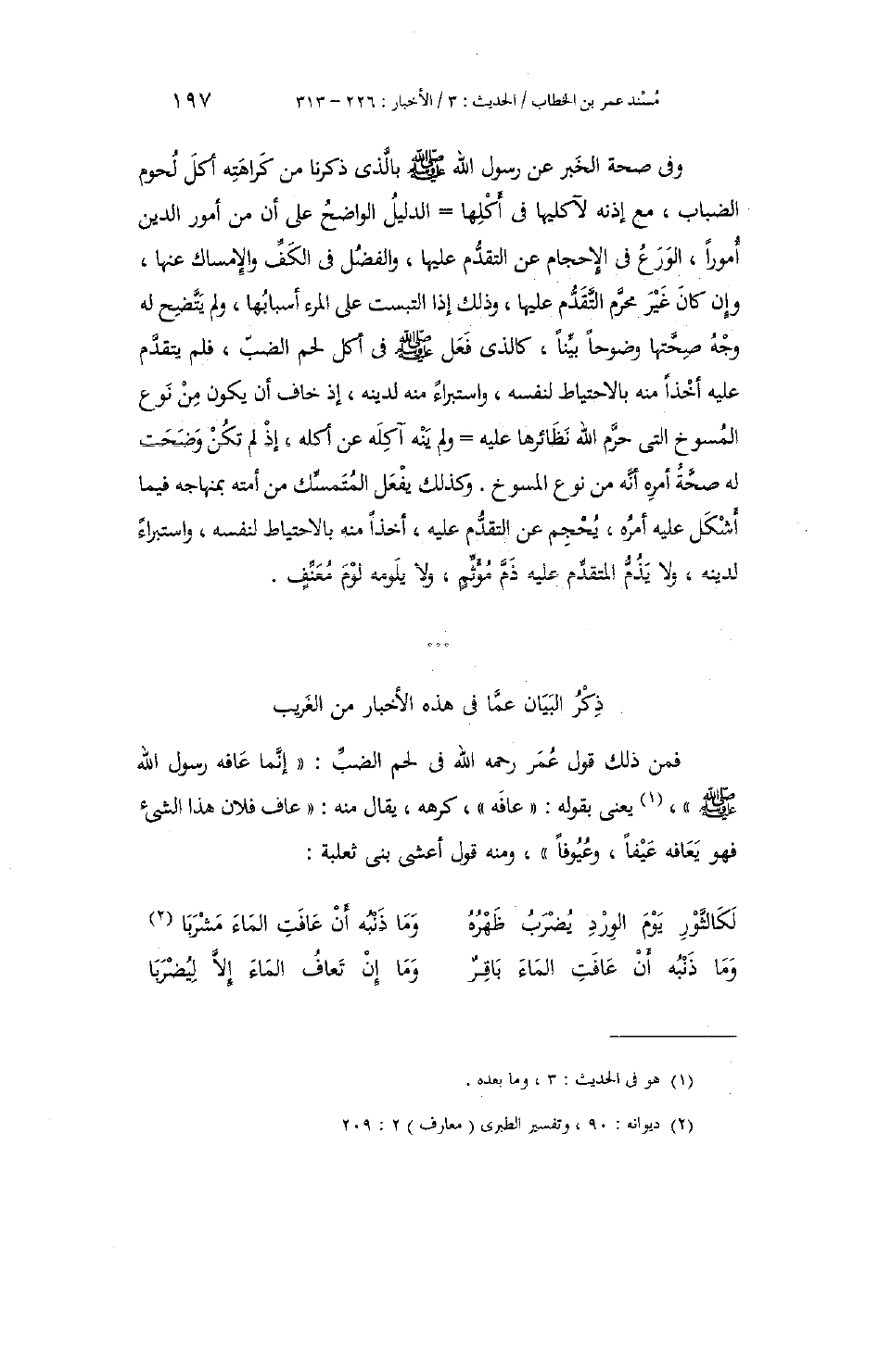 §ذِكْرُ الْبَيَانِ عَمَّا فِي هَذِهِ الْأَخْبَارِ مِنَ الْغَرِيبِ فَمِنْ ذَلِكَ قَوْلُ عُمَرَ رَحِمَهُ اللَّهُ فِي لَحْمِ الضَّبِّ: إِنَّمَا عَافَهُ رَسُولُ اللَّهِ صَلَّى اللهُ عَلَيْهِ وَسَلَّمَ. يَعْنِي بِقَوْلِهِ: عَافَهُ: كَرِهَهُ، يُقَالُ مِنْهُ: عَافَ فُلَانٌ هَذَا الشَّيْءَ فَهُوَ يَعَافُهُ عَيْفًا، وَعُيُوفًا، وَمِنْهُ قَوْلُ أَعْشَى بَنِي ثَعْلَبَةَ: