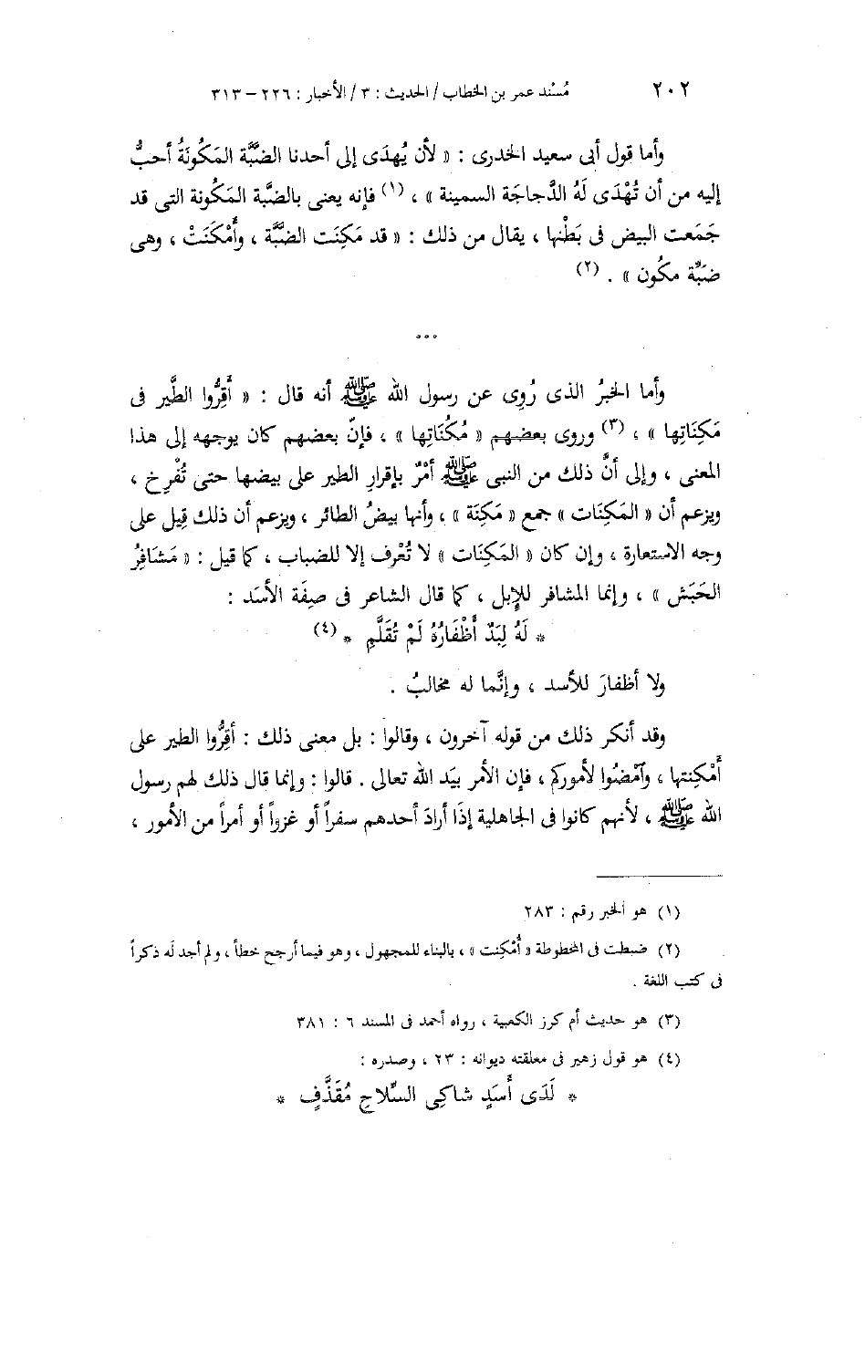 وَأَمَّا قَوْلُ أَبِي سَعِيدٍ الْخُدْرِيِّ: لَأَنْ يُهْدَى إِلَى أَحَدِنَا الضَّبَّةُ الْمَكُونَةُ أَحَبُّ إِلَيْهِ مِنْ أَنْ تُهْدَى لَهُ الدَّجَاجَةُ السَّمِينَةُ، فَإِنَّهُ يَعْنِي بِالضَّبَّةِ الْمَكُونَةِ: الَّتِي قَدْ جَمَعْتِ الْبَيْضَ فِي بَطْنِهَا، يُقَالُ مِنْ ذَلِكَ: قَدْ مَكِنَتِ الضَّبَّةُ، وَأَمْكَنَتْ، وَهِيَ ضَبَّةٌ مَكُونٌ. وَأَمَّا الْخَبَرُ الَّذِي رُوِيَ عَنْ رَسُولِ اللَّهِ صَلَّى اللهُ عَلَيْهِ وَسَلَّمَ أَنَّهُ قَالَ: «أَقِرُّوا الطَّيْرَ فِي مَكِنَاتِهَا» ، وَرَوَى بَعْضُهُمْ: مُكُنَاتِهَا، فَإِنَّ بَعْضَهُمْ كَانَ يُوَجِّهُهُ إِلَى هَذَا الْمَعْنَى، وَإِلَى أَنَّ ذَلِكَ مِنَ النَّبِيِّ صَلَّى اللهُ عَلَيْهِ وَسَلَّمَ أَمْرٌ بِإِقْرَارِ الطَّيْرِ عَلَى بَيْضِهَا حَتَّى تُفْرِخَ، وَيَزْعُمُ أَنَّ الْمَكِنَاتِ جَمْعُ مَكِنَةٍ، وَأَنَّهَا بَيْضُ الطَّائِرِ، وَيَزْعُمُ أَنَّ ذَلِكَ قِيلَ عَلَى وَجْهِ الِاسْتِعَارَةِ، وَإنْ كَانَ الْمَكِنَاتُ لَا تُعْرَفُ إِلَّا لِلضِّبَابِ، كَمَا قِيلَ: مَشَافِرُ الْحَبَشِ، وَإِنَّمَا الْمَشَافِرُ لِلْإِبِلِ، كَمَا قَالَ الشَّاعِرُ فِي صِفَةِ الْأَسَدِ: