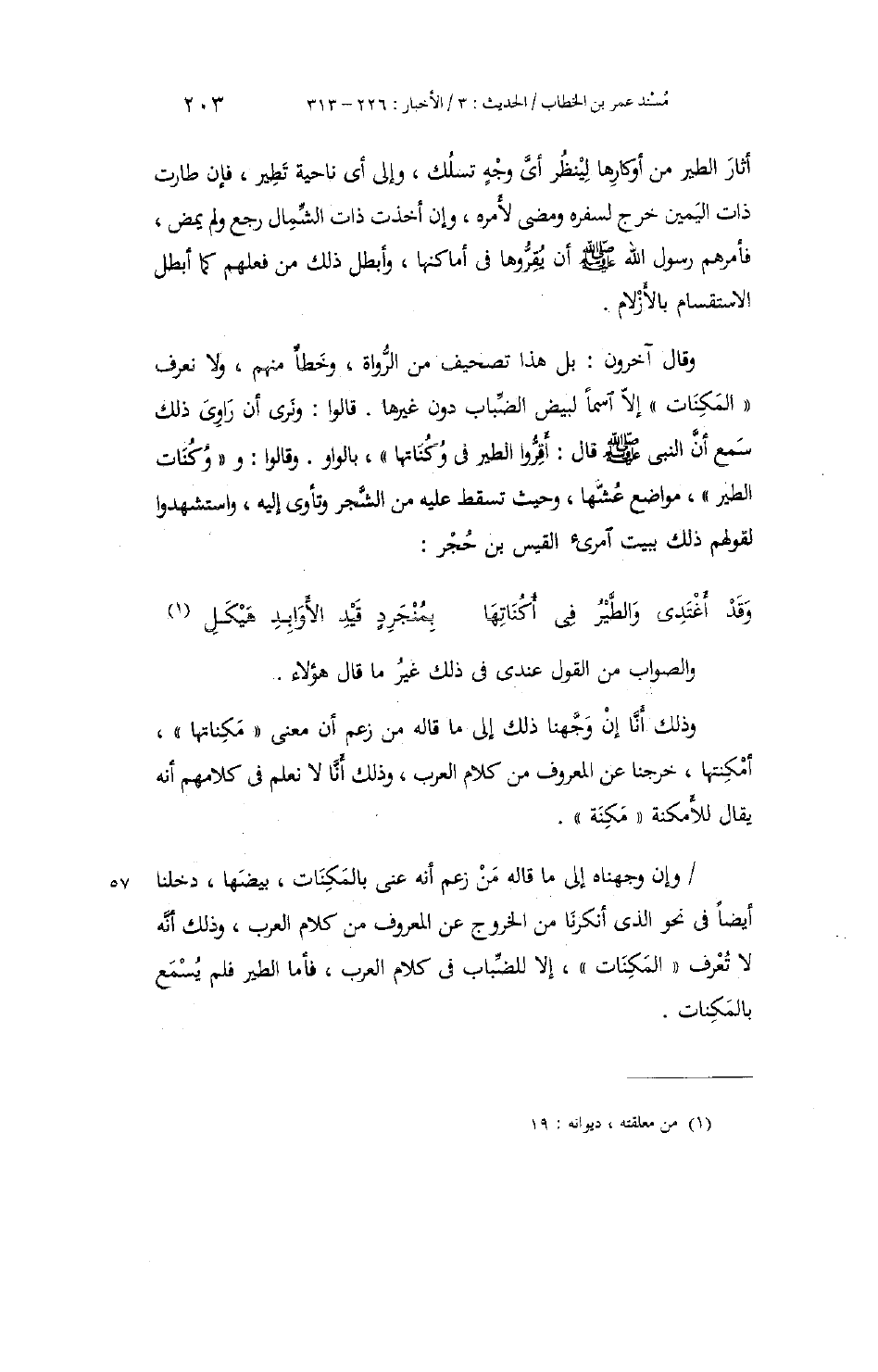 ، أَثَارَ الطَّيْرَ مِنْ أَوْكَارِهَا؛ لِيَنْظُرَ أَيَّ وَجْهٍ تَسْلُكُ، وَإِلَى أَيِّ نَاحِيَةٍ تَطِيرُ، فَإِنْ طَارَتْ ذَاتَ الْيَمِينِ خَرَجَ لِسَفَرِهِ وَمَضَى لِأَمْرِهِ، وَإِنْ أَخَذَتْ ذَاتَ الشِّمَالِ؛ رَجَعَ وَلَمْ يَمْضِ؛ فَأَمَرَهُمْ رَسُولُ اللَّهِ صَلَّى اللهُ عَلَيْهِ وَسَلَّمَ أَنْ يُقِرُّوهَا فِي أَمَاكِنِهَا، وَأَبْطَلَ ذَلِكَ مِنْ فِعْلِهِمْ، كَمَا أَبْطَلَ الِاسْتِقْسَامَ بِالْأَزْلَامِ. وَقَالَ الْآخَرُونَ: بَلْ هَذَا تَصْحِيفٌ مِنَ الرُّوَاةِ، وَخَطَأٌ مِنْهُمْ، وَلَا نَعْرِفُ الْمَكِنَاتِ إِلَّا اسْمًا لِبَيْضِ الضِّبَابِ دُونَ غَيْرِهَا. قَالُوا: وَنَرَى أَنَّ رَاوِيَ ذَلِكَ سَمِعَ أَنَّ النَّبِيَّ صَلَّى اللهُ عَلَيْهِ وَسَلَّمَ قَالَ: «أَقِرُّوا الطَّيْرَ فِي وُكُنَاتِهَا» ، بِالْوَاوِ. وَقَالُوا: وَوُكُنَاتُ الطَّيْرِ: مَوَاضِعُ عُشِّهَا، وَحَيْثُ تَسْقُطُ عَلَيْهِ مِنَ الشَّجَرِ وَتَأْوِي إِلَيْهِ. وَاسْتَشْهَدُوا لِقَوْلِهِمْ ذَلِكَ بِبَيْتِ امْرِئِ الْقَيْسِ بْنِ حُجْرٍ: