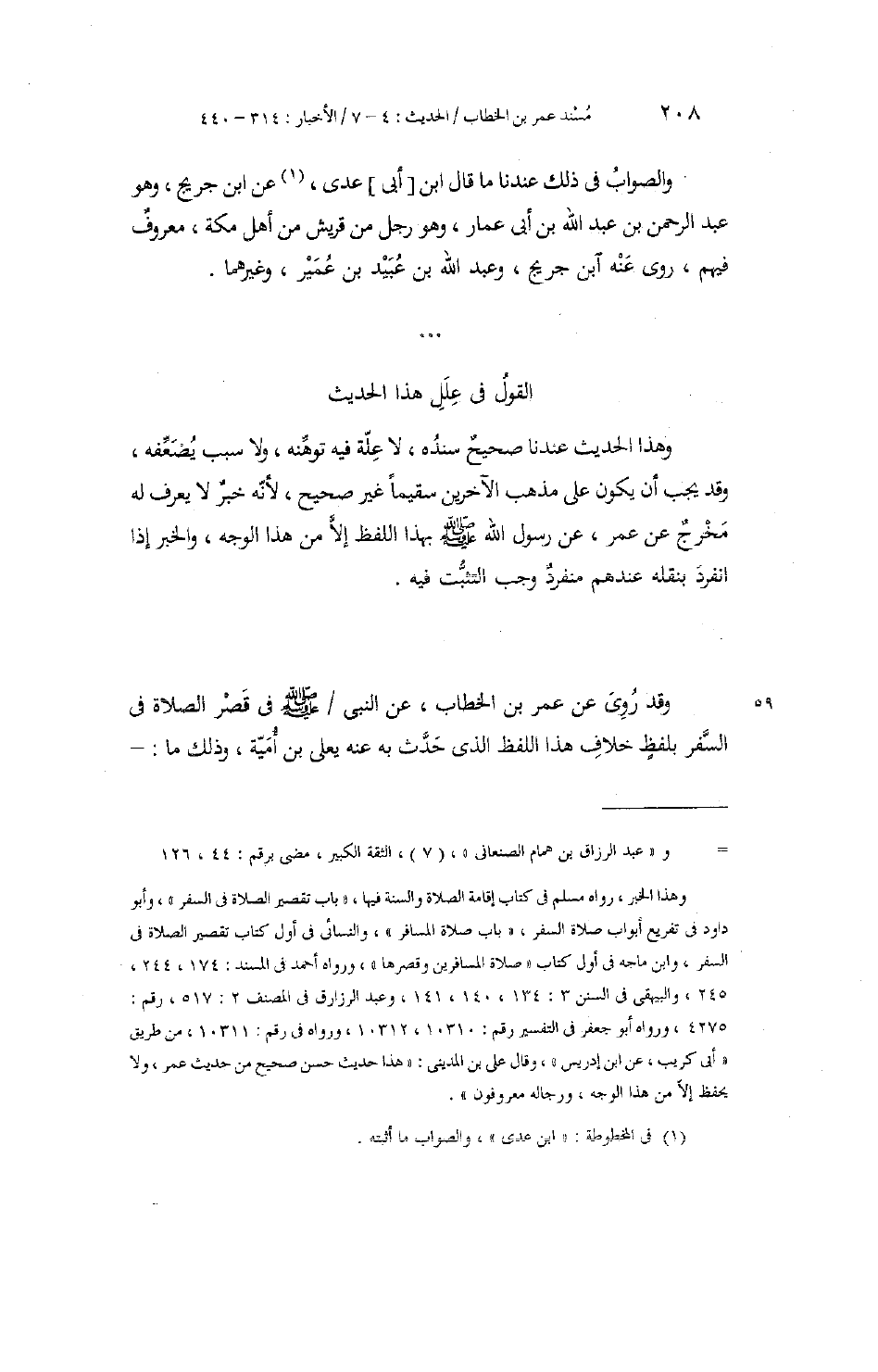 §الْقَوْلُ فِي عِلَلِ هَذَا الْحَدِيثِ وَهَذَا الْحَدِيثُ عِنْدَنَا صَحِيحٌ سَنَدُهُ، لَا عِلَّةَ فِيهِ تُوَهِّنُهُ، وَلَا سَبَبَ يُضَعِّفُهُ، وَقَدْ يَجِبُ أَنْ يَكُونَ عَلَى مَذْهَبِ الْآخَرِينَ سَقِيمًا غَيْرَ صَحِيحٍ؛ لِأَنَّهُ خَبَرٌ لَا يُعْرَفُ لَهُ مَخْرَجٌ عَنْ عُمَرَ، عَنْ رَسُولِ اللَّهِ صَلَّى اللهُ عَلَيْهِ وَسَلَّمَ بِهَذَا اللَّفْظِ إِلَّا مِنْ هَذَا الْوَجْهِ، وَالْخَبَرُ إِذَا انْفَرَدَ بِنَقْلِهِ عِنْدَهُمْ مُنْفَرِدٌ وَجَبَ التَّثَبُّتُ فِيهِ. وَقَدْ رُوِيَ عَنْ عُمَرَ بْنِ الْخَطَّابِ، عَنِ النَّبِيِّ صَلَّى اللهُ عَلَيْهِ وَسَلَّمَ فِي قَصْرِ الصَّلَاةِ فِي السَّفَرِ بِلَفْظٍ خِلَافِ هَذَا اللَّفْظِ الَّذِي حَدَّثَ بِهِ عَنْهُ يَعْلَى بْنُ أُمَيَّةَ، وَذَلِكَ مَا: