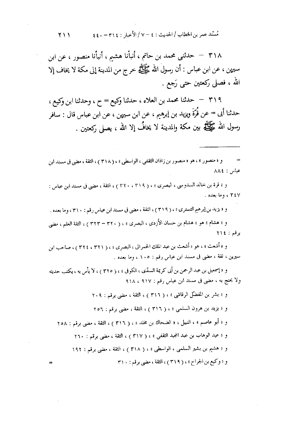 318 - حَدَّثَنِي مُحَمَّدُ بْنُ حَاتِمٍ، أَنْبَأَنَا هُشَيْمٌ، أَنْبَأَنَا مَنْصُورٌ، عَنِ ابْنِ سِيرِينَ، عَنِ ابْنِ عَبَّاسٍ: «أَنَّ رَسُولَ اللَّهِ صَلَّى اللهُ عَلَيْهِ وَسَلَّمَ §خَرَجَ مِنَ الْمَدِينَةِ إِلَى مَكَّةَ، لَا يَخَافُ إِلَّا اللَّهَ، فَصَلَّى رَكْعَتَيْنِ حَتَّى رَجَعَ»