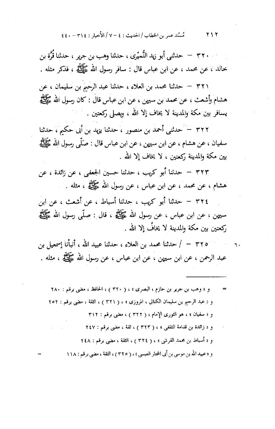 321 - حَدَّثَنَا مُحَمَّدُ بْنُ الْعَلَاءِ، حَدَّثَنَا عَبْدُ الرَّحِيمِ بْنُ سُلَيْمَانَ، عَنْ هِشَامٍ، وَأَشْعَثَ، عَنْ مُحَمَّدِ بْنِ سِيرِينَ، عَنِ ابْنِ عَبَّاسٍ، قَالَ: «كَانَ رَسُولُ اللَّهِ صَلَّى اللهُ عَلَيْهِ وَسَلَّمَ §يُسَافِرُ بَيْنَ مَكَّةَ وَالْمَدِينَةِ لَا يَخَافُ إِلَّا اللَّهَ، وَيُصَلِّي رَكْعَتَيْنِ»