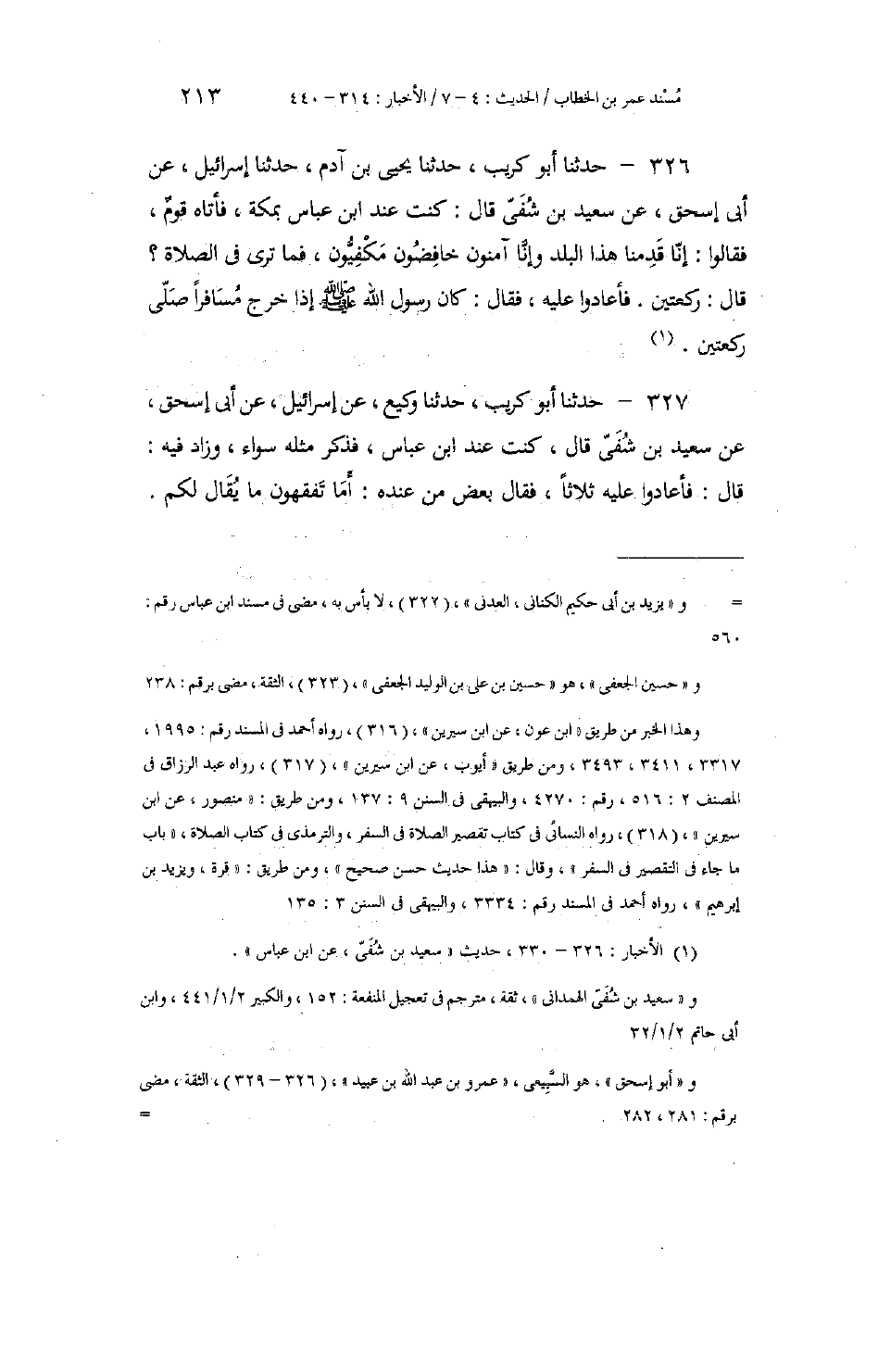 326 - حَدَّثَنَا أَبُو كُرَيْبٍ، حَدَّثَنَا يَحْيَى بْنُ آدَمَ، حَدَّثَنَا إِسْرَائِيلُ، عَنْ أَبِي إِسْحَاقَ، عَنْ سَعِيدِ بْنِ شُفَيٍّ، قَالَ: كُنْتُ عِنْدَ ابْنِ عَبَّاسٍ بِمَكَّةَ، فَأَتَاهُ قَوْمٌ، فَقَالُوا: إِنَّا قَدِمْنَا هَذَا الْبَلَدَ وَإِنَّا آمِنُونَ خَافِضُونَ مَكْفِيُّونَ، فَمَا تَرَى فِي الصَّلَاةِ؟ قَالَ: «رَكْعَتَيْنِ» فَأَعَادُوا عَلَيْهِ، فَقَالَ: «كَانَ رَسُولُ اللَّهِ صَلَّى اللهُ عَلَيْهِ وَسَلَّمَ إِذَا §خَرَجَ مُسَافِرًا صَلَّى رَكْعَتَيْنِ» ،