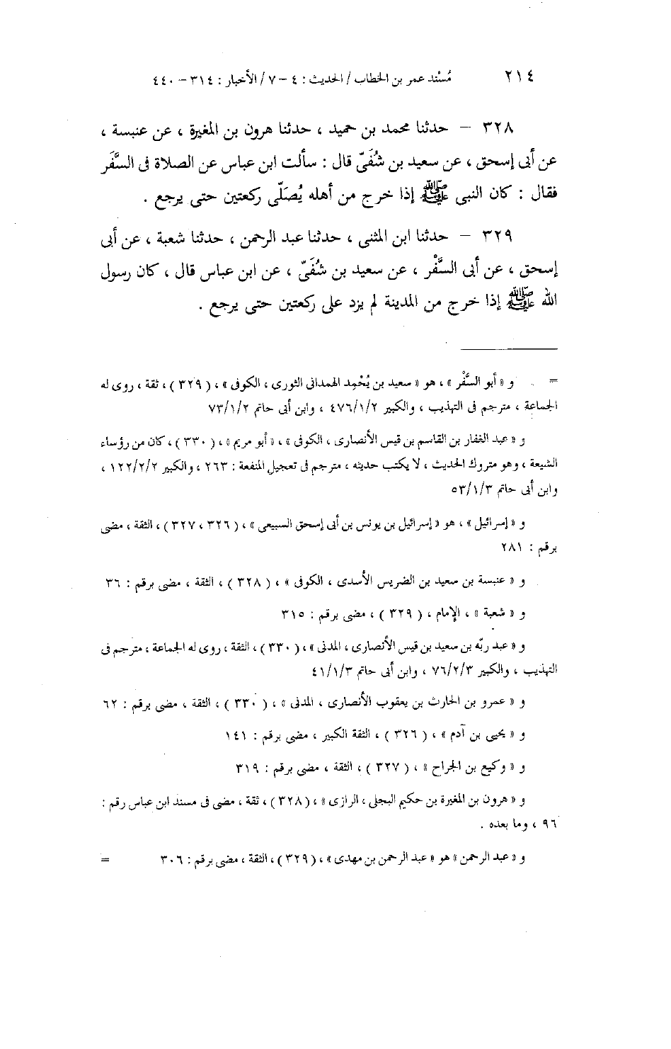 328 - حَدَّثَنَا مُحَمَّدُ بْنُ حُمَيْدٍ، حَدَّثَنَا هَارُونُ بْنُ الْمُغِيرَةِ، عَنْ عَنْبَسَةَ، عَنْ أَبِي إِسْحَاقَ، عَنْ سَعِيدِ بْنِ شُفَيٍّ، قَالَ: سَأَلْتُ ابْنَ عَبَّاسٍ عَنِ الصَّلَاةِ فِي السَّفَرِ فَقَالَ: «كَانَ النَّبِيُّ صَلَّى اللهُ عَلَيْهِ وَسَلَّمَ إِذَا §خَرَجَ مِنْ أَهْلِهِ يُصَلِّي رَكْعَتَيْنِ حَتَّى يَرْجِعَ»