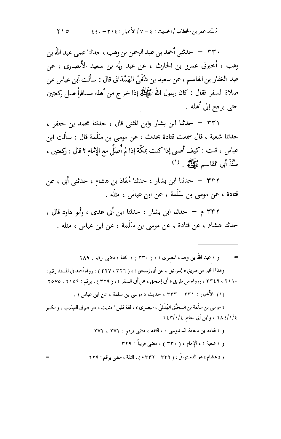 330 - حَدَّثَنِي أَحْمَدُ بْنُ عَبْدِ الرَّحْمَنِ بْنِ وَهْبٍ، حَدَّثَنَا عَمِّي عَبْدُ اللَّهِ بْنُ وَهْبٍ، أَخْبَرَنِي عَمْرُو بْنُ الْحَارِثِ، عَنْ عَبْدِ رَبِّهِ بْنِ سَعِيدٍ الْأَنْصَارِيِّ، عَنْ عَبْدِ الْغَفَّارِ بْنِ الْقَاسِمِ، عَنْ سَعِيدِ بْنِ شُفَيٍّ الْهَمْدَانِيُّ، قَالَ: سَأَلْتُ ابْنَ عَبَّاسٍ عَنْ صَلَاةِ السَّفَر، فَقَالَ: «كَانَ رَسُولُ اللَّهِ صَلَّى اللهُ عَلَيْهِ وَسَلَّمَ إِذَا §خَرَجَ مِنْ أَهْلِهِ مُسَافِرًا صَلَّى رَكْعَتَيْنِ حَتَّى يَرْجِعَ إِلَى أَهْلِهِ»