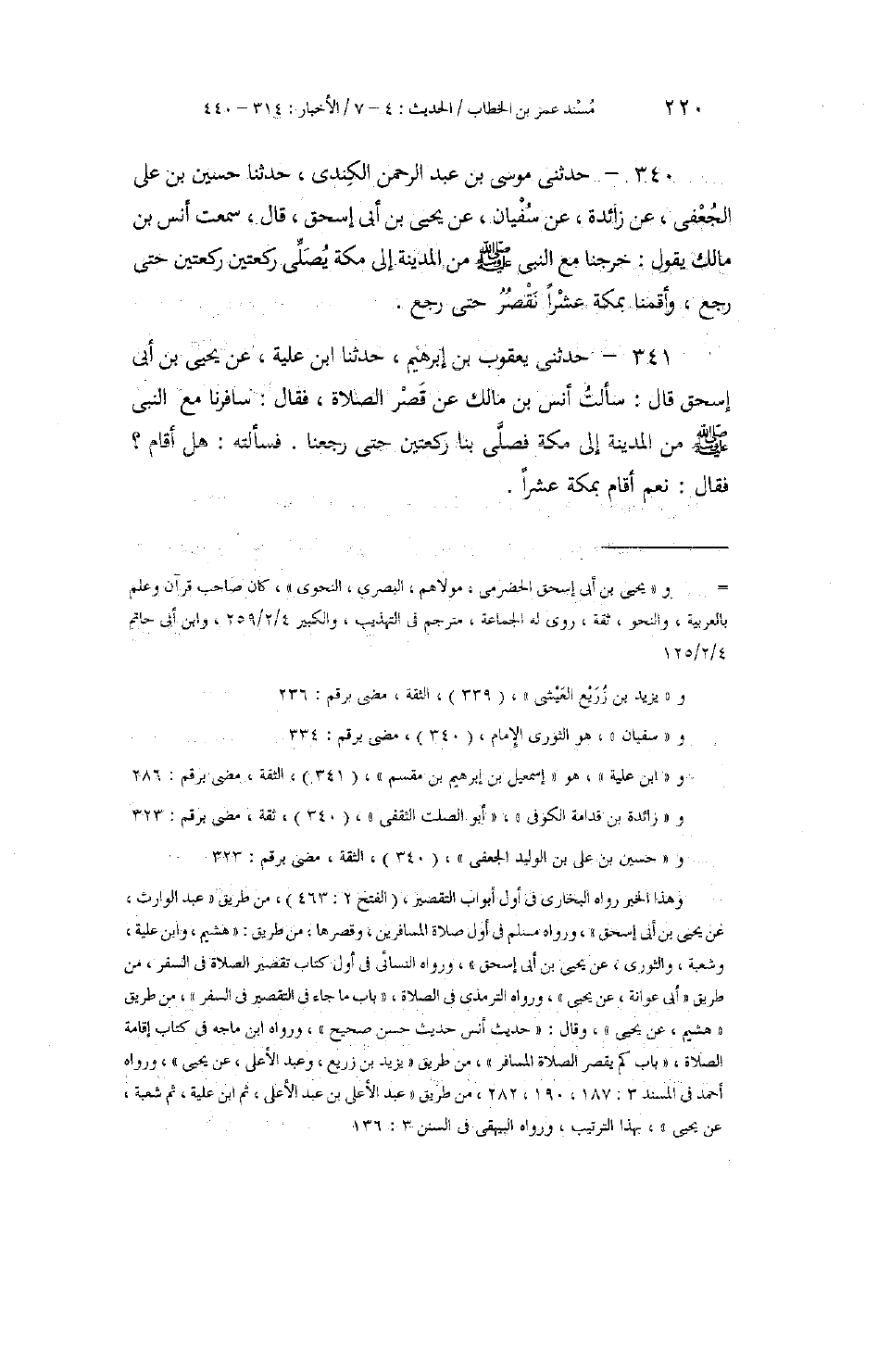 340 - حَدَّثَنِي مُوسَى بْنُ عَبْدِ الرَّحْمَنِ الْكِنْدِيُّ، حَدَّثَنَا حُسَيْنُ بْنُ عَلِيٍّ الْجُعْفِيُّ، عَنْ زَائِدَةَ، عَنْ سُفْيَانَ، عَنْ يَحْيَى بْنِ أَبِي إِسْحَاقَ، قَالَ: سَمِعْتُ أَنَسَ بْنَ مَالِكٍ، يَقُولُ: «§خَرَجْنَا مَعَ النَّبِيِّ صَلَّى اللهُ عَلَيْهِ وَسَلَّمَ مِنَ الْمَدِينَةِ إِلَى مَكَّةَ يُصَلِّي رَكْعَتَيْنِ رَكْعَتَيْنِ حَتَّى رَجَعَ، وَأَقَمْنَا بِمَكَّةَ عَشْرًا نَقْصُرُ حَتَّى رَجَعَ»