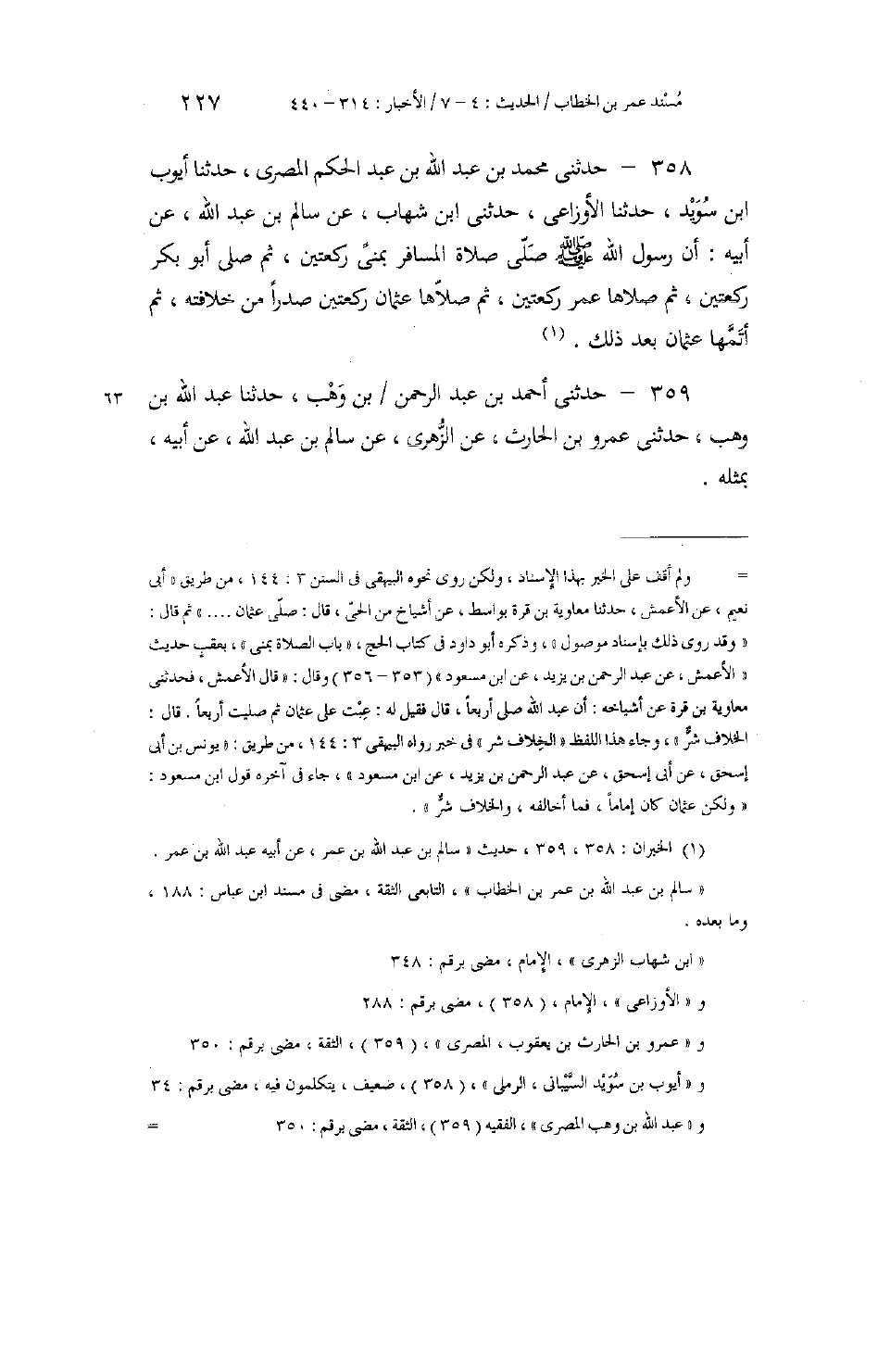 358 - حَدَّثَنِي مُحَمَّدُ بْنُ عَبْدِ اللَّهِ بْنِ عَبْدِ الْحَكَمِ الْمِصْرِيُّ، حَدَّثَنَا أَيُّوبُ بْنُ سُوَيْدٍ، حَدَّثَنَا الْأَوْزَاعِيُّ، حَدَّثَنِي ابْنُ شِهَابٍ، عَنْ سَالِمِ بْنِ عَبْدِ اللَّهِ، عَنْ أَبِيهِ: «أَنَّ رَسُولِ اللَّهِ صَلَّى اللهُ عَلَيْهِ وَسَلَّمَ §صَلَّى صَلَاةَ الْمُسَافِرِ بِمِنًى رَكْعَتَيْنِ، ثُمَّ صَلَّى أَبُو بَكْرٍ رَكْعَتَيْنِ، ثُمَّ صَلَّاهَا عُمَرُ رَكْعَتَيْنِ، ثُمَّ صَلَّاهَا عُثْمَانُ رَكْعَتَيْنِ صَدْرًا مِنْ خِلَافَتِهِ، ثُمَّ أَتَمَّهَا عُثْمَانُ بَعْدَ ذَلِكَ» ،