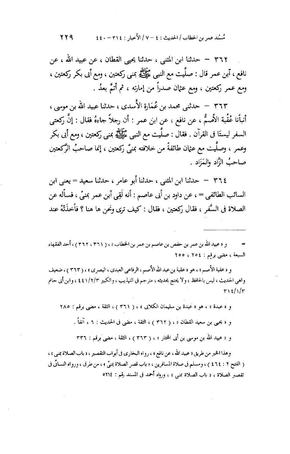 363 - حَدَّثَنِي مُحَمَّدُ بْنُ عُمَارَةَ الْأَسَدِيُّ، حَدَّثَنَا عُبَيْدُ اللَّهِ بْنُ مُوسَى، أَنْبَأَنَا عُقْبَةُ الْأَصَمُّ، عَنْ نَافِعٍ، عَنِ ابْنِ عُمَرَ: أَنَّ رَجُلًا، جَاءَهُ فَقَالَ: إِنَّ رَكْعَتَيِ السَّفَرِ لَيْسَتَا فِي الْقُرْآنِ. فَقَالَ: «§صَلَّيْتُ مَعَ النَّبِيِّ صَلَّى اللهُ عَلَيْهِ وَسَلَّمَ بِمِنًى رَكْعَتَيْنِ، وَمَعَ أَبِي بَكْرٍ وَعُمَرَ، وَصَلَّيْتُ مَعَ عُثْمَانَ طَائِفَةً مِنْ خِلَافَتِهِ بِمِنًى رَكْعَتَيْنِ، إِنَّمَا صَاحِبُ الرَّكْعَتَيْنِ صَاحِبُ الزَّادِ وَالْمَزَادِ»