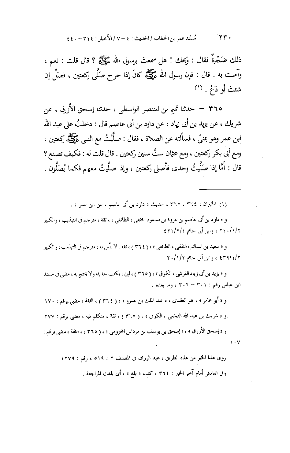 365 - حَدَّثَنَا تَمِيمُ بْنُ الْمُنْتَصِرِ الْوَاسِطِيُّ، حَدَّثَنَا إِسْحَاقُ الْأَزْرَقُ، عَنْ شَرِيكٍ، عَنْ يَزِيدَ بْنِ أَبِي زِيَادٍ، عَنْ دَاوُدَ بْنِ أَبِي عَاصِمٍ، قَالَ: دَخَلْتُ عَلَى عَبْدِ اللَّهِ بْنِ عُمَرَ وَهُوَ بِمِنًى، فَسَأَلْتُهُ عَنِ الصَّلَاةِ، فَقَالَ: " §صَلَّيْتُ مَعَ النَّبِيِّ صَلَّى اللهُ عَلَيْهِ وَسَلَّمَ رَكْعَتَيْنِ، وَمَعَ أَبِي بَكْرٍ رَكْعَتَيْنِ، وَمَعَ عُثْمَانَ سِتَّ سِنِينَ رَكْعَتَيْنِ. قَالَ: قُلْتُ لَهُ: فَكَيْفَ تَصْنَعُ؟ قَالَ: أَمَّا إِذَا صَلَّيْتُ وَحْدِي فَأُصَلِّي رَكْعَتَيْنِ، وَإِذَا صَلَّيْتُ مَعَهُمْ فَكَمَا يُصَلُّونَ "