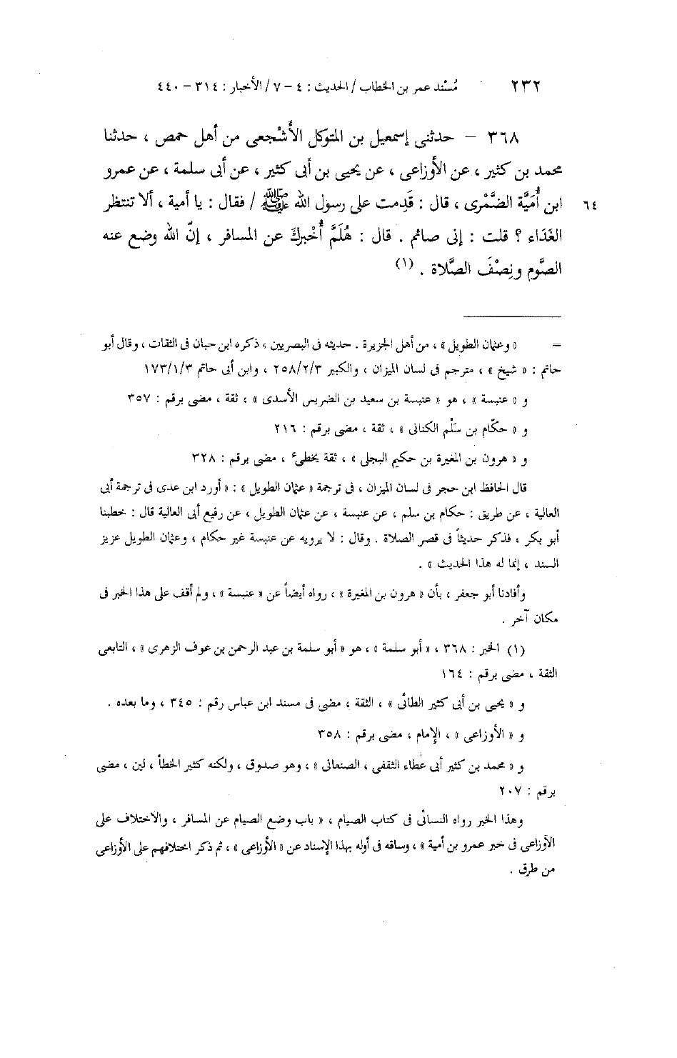 368 - حَدَّثَنِي إِسْمَاعِيلُ بْنُ الْمُتَوَكِّلِ الْأَشْجَعِيُّ، - مِنْ أَهْلِ حِمْصٍ - حَدَّثَنَا مُحَمَّدُ بْنُ كَثِيرٍ، عَنِ الْأَوْزَاعِيِّ، عَنْ يَحْيَى بْنِ أَبِي كَثِيرٍ، عَنْ أَبِي سَلَمَةَ، عَنْ عَمْرِو بْنِ أُمَيَّةَ الضَّمْرِيِّ، قَالَ: قَدِمْتُ عَلَى رَسُولِ اللَّهِ صَلَّى اللهُ عَلَيْهِ وَسَلَّمَ فَقَالَ: «يَا أُمَيَّةُ §أَلَا تَنْتَظِرُ الْغَدَاءَ؟» قُلْتُ: إِنِّي صَائِمٌ. قَالَ: «هَلُمَّ أُخْبِرْكَ عَنِ الْمُسَافِرِ، إِنَّ اللَّهَ وَضَعَ عَنْهُ الصَّوْمَ وَنِصْفَ الصَّلَاةِ»