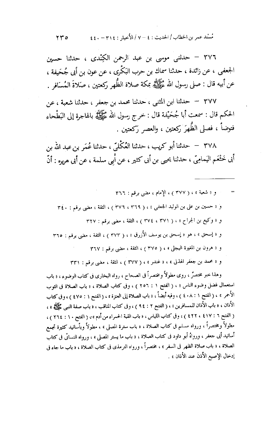 376 - حَدَّثَنِي مُوسَى بْنُ عَبْدِ الرَّحْمَنِ الْكِنْدِيُّ، حَدَّثَنَا حُسَيْنٌ الْجُعْفِيُّ، عَنْ زَائِدَةَ، حَدَّثَنَا سِمَاكُ بْنُ حَرْبٍ الْبَكْرِيُّ، عَنْ عَوْنِ بْنِ أَبِي جُحَيْفَةَ، عَنْ أَبِيهِ، قَالَ: «§صَلَّى رَسُولُ اللَّهِ صَلَّى اللهُ عَلَيْهِ وَسَلَّمَ بِمَكَّةَ صَلَاةَ الظُّهْرِ رَكْعَتَيْنِ، صَلَاةَ الْمُسَافِرِ»