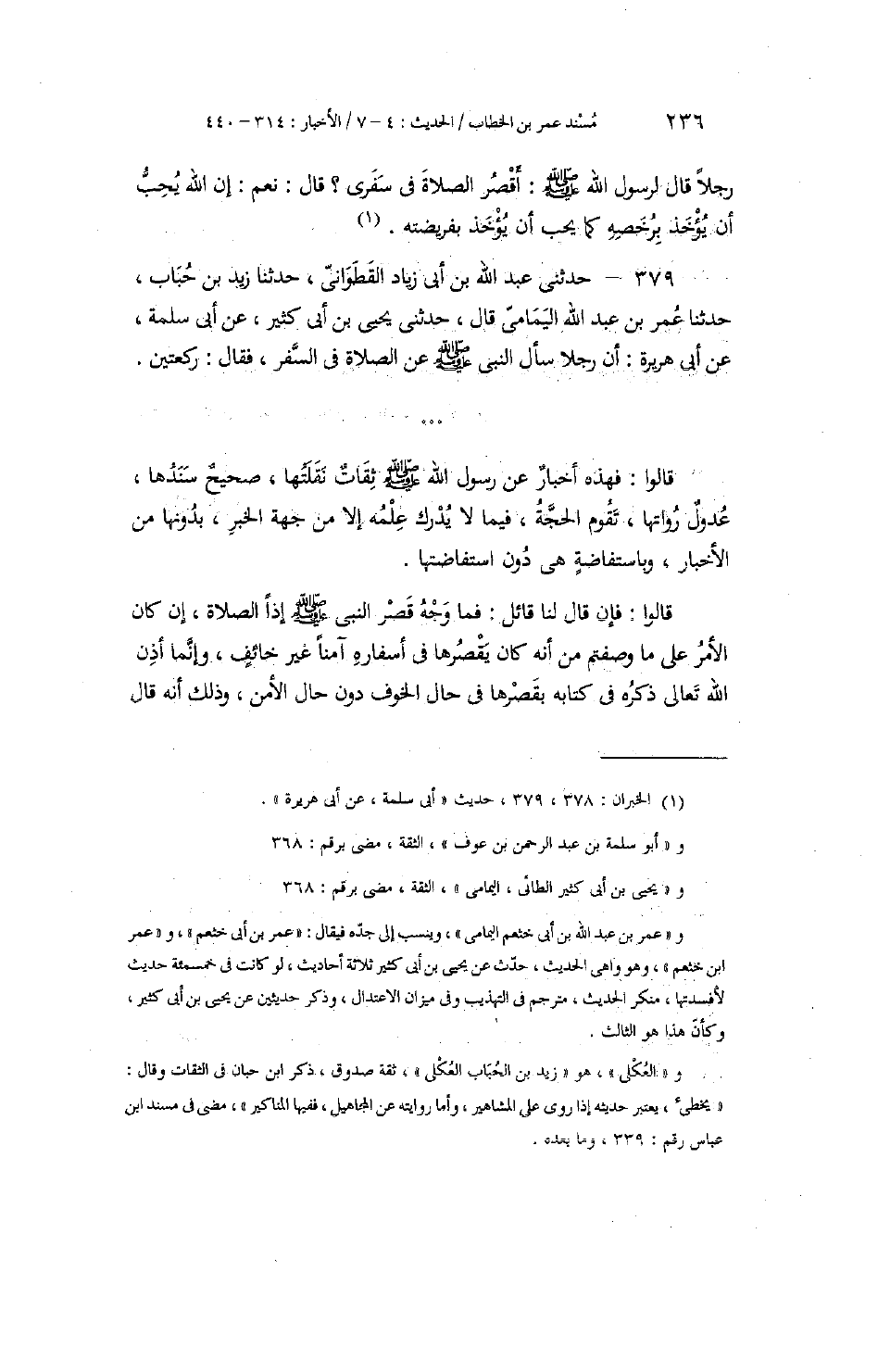 379 - حَدَّثَنِي عَبْدُ اللَّهِ بْنُ أَبِي زِيَادٍ الْقَطَوَانِيُّ، حَدَّثَنَا زَيْدُ بْنُ حُبَابٍ، حَدَّثَنَا عُمَرُ بْنُ عَبْدِ اللَّهِ الْيَمَامِيُّ، قَالَ: حَدَّثَنِي يَحْيَى بْنُ أَبِي كَثِيرٍ، عَنْ أَبِي سَلَمَةَ، عَنْ أَبِي هُرَيْرَةَ: أَنَّ رَجُلًا، سَأَلَ النَّبِيَّ صَلَّى اللهُ عَلَيْهِ وَسَلَّمَ عَنِ الصَّلَاةِ فِي السَّفَرِ، فَقَالَ: «§رَكْعَتَيْنِ» قَالُوا: فَهَذِهِ أَخْبَارٌ عَنْ رَسُولِ اللَّهِ صَلَّى اللهُ عَلَيْهِ وَسَلَّمَ ثِقَاتٌ نَقَلَتُهَا، صَحِيحٌ سَنَدُهَا، عُدُولٌ رُوَاتُهَا، تَقُومُ الْحُجَّةُ - فِيمَا لَا يُدْرَكُ عِلْمُهُ إِلَّا مِنْ جِهَةِ الْخَبَرِ - بِدُونِهَا مِنَ الْأَخْبَارِ، وَبِاسْتِفَاضَةٍ هِيَ دُونَ اسْتِفَاضَتِهَا. قَالُوا: فَإِنْ قَالَ لَنَا قَائِلٌ: فَمَا وَجْهُ قَصْرِ النَّبِيِّ صَلَّى اللهُ عَلَيْهِ وَسَلَّمَ إِذًا الصَّلَاةَ، إنْ كَانَ الْأَمْرُ عَلَى مَا وَصَفْتُمْ مِنْ أَنَّهُ كَانَ يَقْصُرُهَا فِي أَسْفَارِهِ آمِنًا غَيْرَ خَائِفٍ، وَإِنَّمَا أَذِنَ اللَّهُ تَعَالَى ذِكْرُهُ فِي كِتَابِهِ بِقَصْرِهَا فِي حَالِ الْخَوْفِ دُونَ حَالِ الْأَمْنِ، وَذَلِكَ أَنَّهُ قَالَ -[237]- جَلَّ ثَنَاؤُهُ: {وَإِذَا ضَرَبْتُمْ فِي الْأَرْضِ فَلَيْسَ عَلَيْكُمْ جُنَاحٌ أَنْ تَقْصُرُوا مِنَ الصَّلَاةِ إِنْ خِفْتُمْ أَنْ يَفْتِنَكُمُ الَّذِينَ كَفَرُوا} [النساء: 101] ، أَتَقُولُونَ ذَلِكَ مِنْ فِعْلِهِ لِمَا فِي التَّنْزِيلِ نَسْخٌ، فَقَدْ عَلِمْتُمْ إِنْكَارَ مَنْ يُنْكِرُ نَسْخَ السُّنَّةِ الْقُرْآنَ، وَإنْ كَانَ لَهُمْ فِي ذَلِكَ مُخَالِفُونَ؟ أَمْ تَقُولُونَ: ذَلِكَ زِيَادَةُ حُكْمٍ مِنْ رَسُولِ اللَّهِ صَلَّى اللهُ عَلَيْهِ وَسَلَّمَ فِي أَحْكَامِ صَلَاةِ الْمُسَافِرِ؟ فَمَا بُرْهَانُكُمْ عَلَى ذَلِكَ، وَقَدْ عَلِمْتُمْ خِلَافَ مَنْ يُخَالِفُكُمْ فِيهِ مِنَ الْأَئِمَّةِ؟ أَمْ مَا وَجْهُ ذَلِكَ؟ قُلْنَا لَهُمْ: قَدِ اخْتَلَفَ الْأَئِمَّةُ قَبْلَنَا فِي ذَلِكَ. فَقَالَتْ مِنْهُمْ طَائِفَةٌ - وَهُمُ الَّذِينَ قَالُوا: فَرْضُ الصَّلَاةِ فِي السَّفَرِ رَكْعَتَانِ -: لَمْ يَزَلْ حُكْمُ اللَّهِ جَلَّ ثَنَاؤُهُ فِي الْوَاجِبِ عَنْ عَدَدِ الصَّلَاةِ عَلَى الْمُسَافِرِ - مِنْ لَدُنْ فَرَضَهَا عَلَى خَلْقِهِ - رَكْعَتَيْنِ، إِلَّا مَا كَانَ مِنْ صَلَاةِ الْمَغْرِبِ، فَإِنَّهَا ثَلَاثٌ. فَأَمَّا قَوْلُهُ تَعَالَى: {فَلَيْسَ عَلَيْكُمْ جُنَاحٌ أَنْ تَقْصُرُوا مِنَ الصَّلَاةِ إِنْ خِفْتُمْ أَنْ يَفْتِنَكُمُ الَّذِينَ كَفَرُوا} [النساء: 101] ، فَإِنَّهُ إِذْنٌ مِنَ اللَّهِ تَعَالَى بِالْقَصْرِ عَنْ حُدُودِهَا الَّتِي أَوْجَبَهَا عَلَى الْآمِنِ فِي حَالِ الطُّمَأَنِينَةِ، لَا إِذْنٌ فِي الْقَصْرِ عَنْ عَدَدِهَا. وَقَدْ مَضَى ذِكْرُنَا قَائِلِي هَذِهِ الْمَقَالَةِ فِي كِتَابِنَا هَذَا قَبْلُ، فَكَرِهْنَا تَطْوِيلَ الْكِتَابِ بِإِعَادَةِ ذِكْرِهِمْ فِي هَذَا الْمَوْضِعِ، وَقَالَتْ مِنْهُمْ طَائِفَةٌ أُخْرَى: بَلْ قَصْرُ الصَّلَاةِ فِي السَّفَرِ مِنْ أَرْبَعٍ إِلَى اثْنَتَيْنِ، رُخْصَةٌ مِنَ اللَّهِ جَلَّ ذِكْرُهُ لِعِبَادِهِ، وَصَدَقَةٌ مِنْهُ تَصَدَّقَ بِهَا عَلَيْهِمْ؛ تَخْفِيفًا مِنْهُ عَنْهُمْ، كَمَا قَالَ عُمَرُ رَحْمَةُ اللَّهُ عَلَيْهِ عَنْ رَسُولِ اللَّهِ صَلَّى اللهُ عَلَيْهِ وَسَلَّمَ، وَحُكْمٌ مِنْ حُكْمِ قَوْلِ اللَّهِ عَزَّ وَجَلَّ: {فَلَيْسَ عَلَيْكُمْ جُنَاحٌ أَنْ تَقْصُرُوا مِنَ الصَّلَاةِ إِنْ خِفْتُمْ أَنْ يَفْتِنَكُمُ الَّذِينَ -[238]- كَفَرُوا} [النساء: 101] ، بِمَعْزِلٍ. وَذَلِكَ أَنَّ الْإِذْنَ مِنَ اللَّهِ جَلَّ ثَنَاؤُهُ بِقَصْرِ الصَّلَاةِ فِي حَالِ الْخَوْفِ، إِنَّمَا هُوَ إِذْنٌ مِنْهُ بِقَصْرِهَا مِنَ اثْنَتَيْنِ إِلَى وَاحِدَةٍ، وَأَ
