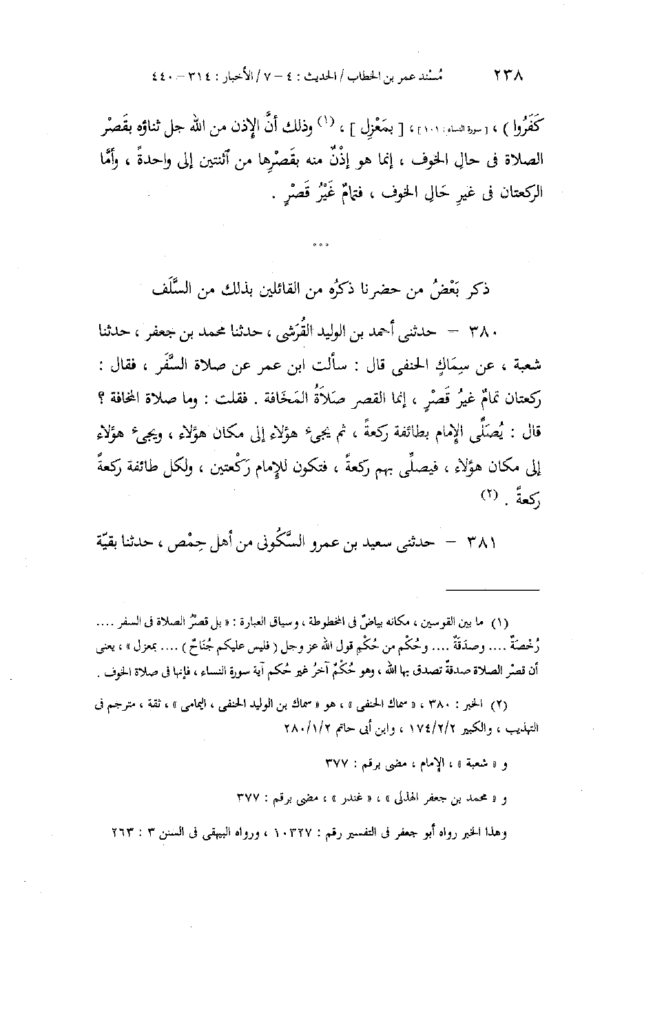 380 - حَدَّثَنِي أَحْمَدُ بْنُ الْوَلِيدِ الْقُرَشِيُّ، حَدَّثَنَا مُحَمَّدُ بْنُ جَعْفَرٍ، حَدَّثَنَا شُعْبَةُ، عَنْ سِمَاكٍ الْحَنَفِيِّ، قَالَ: سَأَلْتُ ابْنَ عُمَرَ عَنْ صَلَاةِ السَّفَرِ، فَقَالَ: «§رَكْعَتَانِ تَمَامٌ غَيْرُ قَصْرٍ، إِنَّمَا الْقَصْرُ صَلَاةُ الْمَخَافَةِ» فَقُلْتُ: وَمَا صَلَاةُ الْمَخَافَةِ؟ قَالَ: «يُصَلِّي الْإِمَامُ بِطَائِفَةٍ رَكْعَةً، ثُمَّ يَجِيءُ هَؤُلَاءِ إِلَى مَكَانِ هَؤُلَاءِ، وَيَجِيءُ هَؤُلَاءِ إِلَى مَكَانِ هَؤُلَاءِ، فَيُصَلِّي بِهِمْ رَكْعَةً، فَتَكُونُ لِلْإِمَامِ رَكْعَتَيْنِ، وَلِكُلِّ طَائِفَةٍ رَكْعَةً رَكْعَةً»