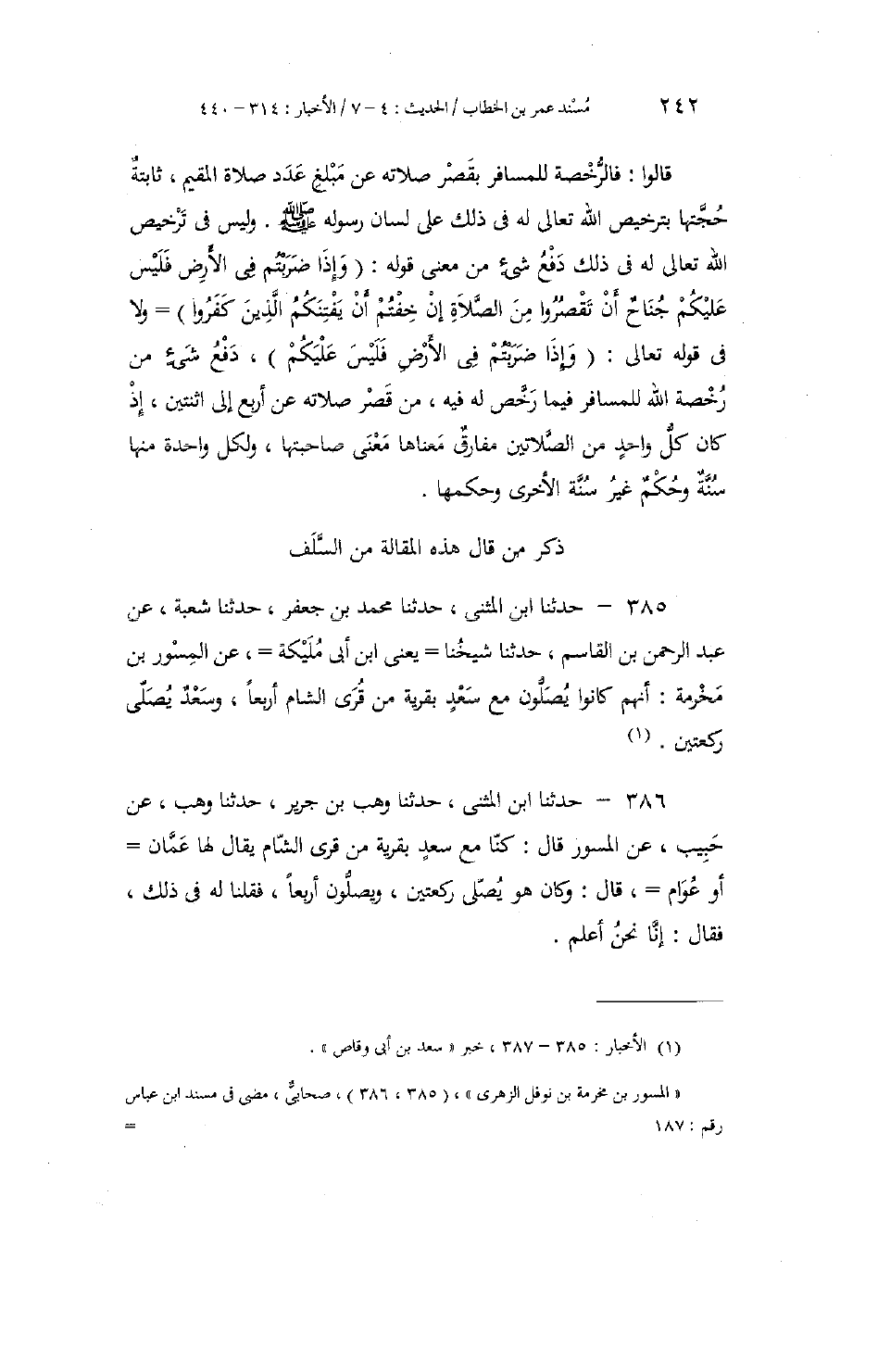386 - حَدَّثَنَا ابْنُ الْمُثَنَّى، حَدَّثَنَا وَهْبُ بْنُ جَرِيرٍ، حَدَّثَنَا وَهْبٌ، عَنْ حَبِيبٍ، عَنِ الْمِسْوَرِ، قَالَ: §كُنَّا مَعَ سَعْدٍ بِقَرْيَةٍ مِنْ قُرَى الشَّامِ يُقَالُ لَهَا عَمَّانُ أَوْ عُوَامُ. قَالَ: وَكَانَ هُوَ يُصَلِّي رَكْعَتَيْنِ، وَيُصَلُّونَ أَرْبَعًا، فَقُلْنَا لَهُ فِي ذَلِكَ، فَقَالَ: «إِنَّا نَحْنُ أَعْلَمُ»