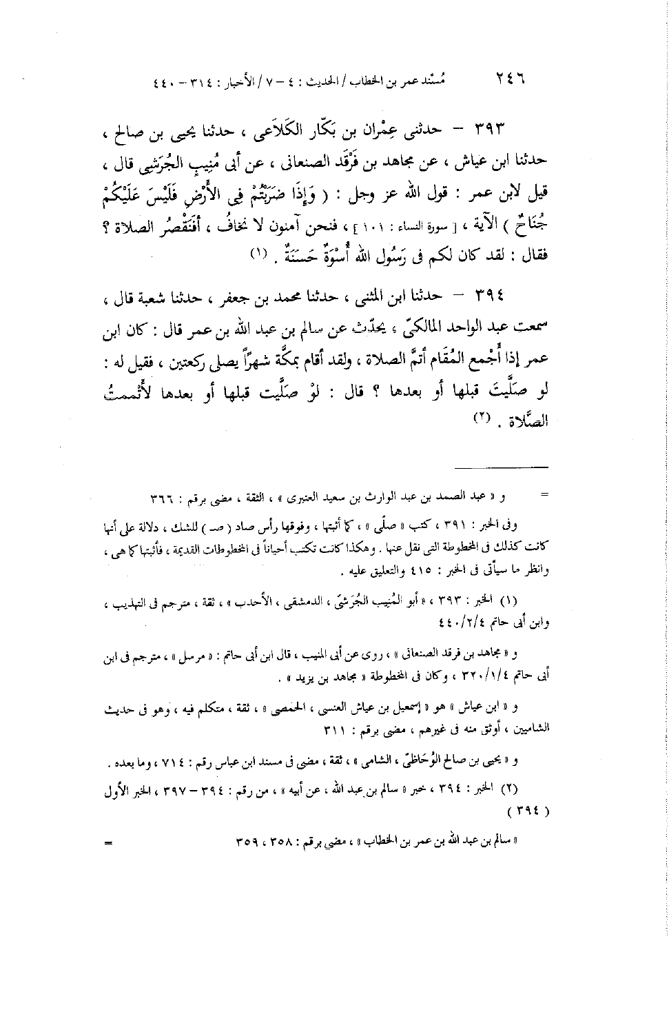 393 - حَدَّثَنِي عِمْرَانُ بْنُ بَكَّارٍ الْكَلَاعِيُّ، حَدَّثَنَا يَحْيَى بْنُ صَالِحٍ، حَدَّثَنَا ابْنُ عَيَّاشٍ، عَنْ مُجَاهِدِ بْنِ فَرْقَدٍ الصَّنْعَانِيِّ، عَنْ أَبِي مُنِيبٍ الْجُرَشِيِّ، قَالَ: قِيلَ لِابْنِ عُمَرَ: قَوْلُ اللَّهِ عَزَّ وَجَلَّ: {وَإِذَا ضَرَبْتُمْ فِي الْأَرْضِ فَلَيْسَ عَلَيْكُمْ جُنَاحٌ} [النساء: 101] الْآيَةَ، فَنَحْنُ آمِنُونَ لَا نَخَافُ، أَفَنَقْصُرُ الصَّلَاةَ؟ فَقَالَ: «§لَقَدْ كَانَ لَكُمْ فِي رَسُولِ اللَّهِ أُسْوَةٌ حَسَنَةٌ»