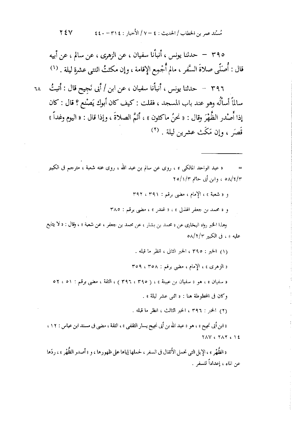 395 - حَدَّثَنَا يُونُسُ، أَنْبَأَنَا سُفْيَانُ، عَنِ الزُّهْرِيِّ، عَنْ سَالِمٍ، عَنْ أَبِيهِ، قَالَ: «§أُصَلِّي صَلَاةَ السَّفَرِ، مَالَمْ أُجْمِعِ الْإِقَامَةَ، وَإِنْ مَكَثْتُ اثْنَتَيْ عَشْرَةَ لَيْلَةً»