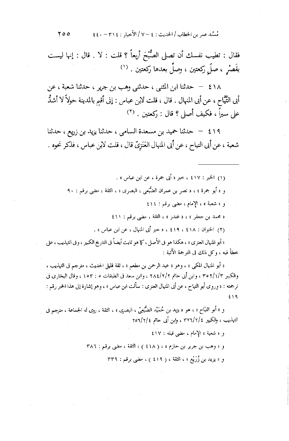 419 - حَدَّثَنَا حُمَيْدُ بْنُ مَسْعَدَةَ السَّامِيُّ، حَدَّثَنَا يَزِيدُ بْنُ زُرَيْعٍ، حَدَّثَنَا شُعْبَةُ، عَنْ أَبِي التَّيَّاحِ، عَنْ أَبِي الْمِنْهَالِ الْعَنَزِيِّ، قَالَ: قُلْتُ لِابْنِ عَبَّاسٍ فَذَكَرَ نَحْوَهُ
