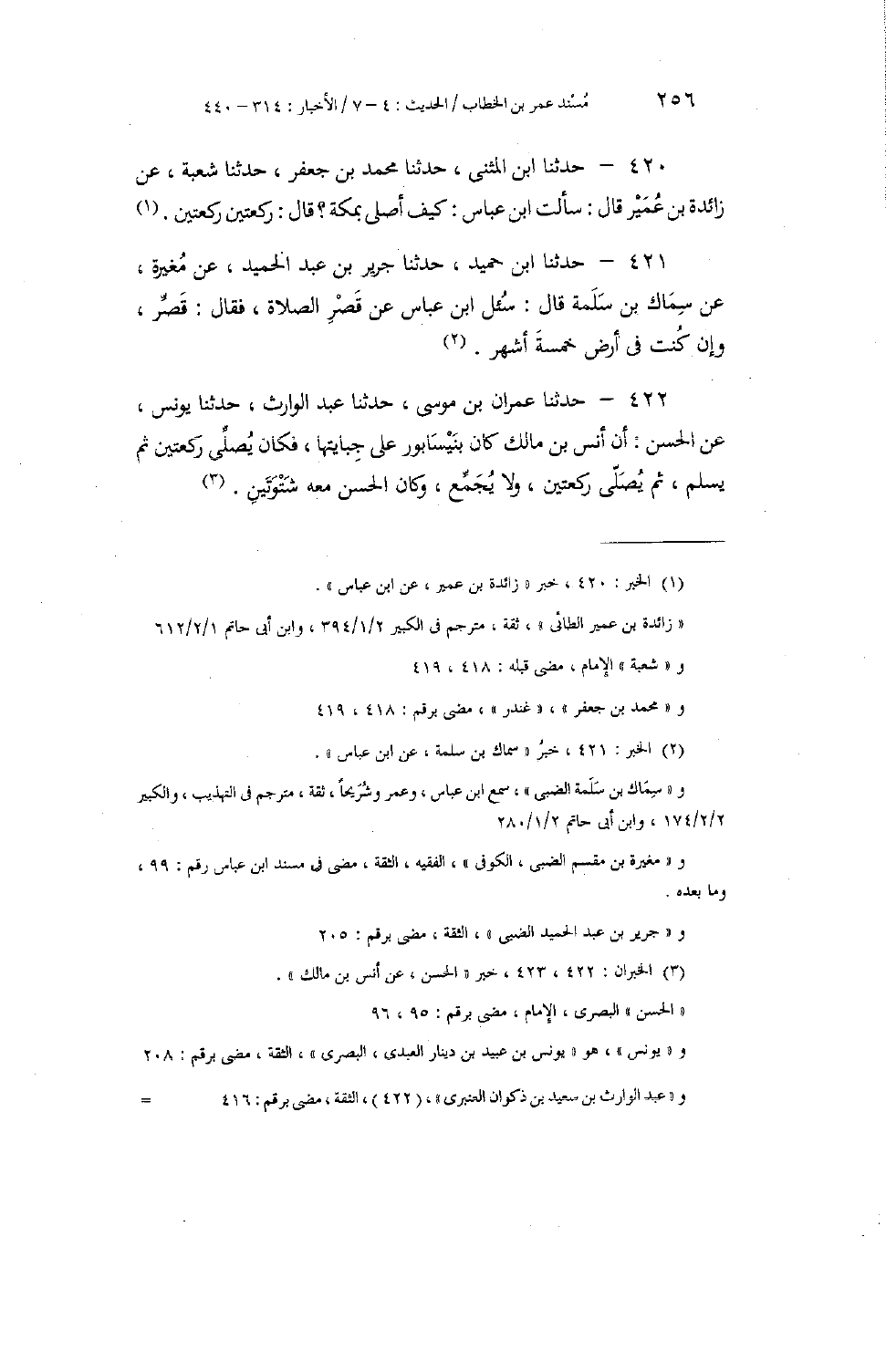 420 - حَدَّثَنَا ابْنُ الْمُثَنَّى، حَدَّثَنَا مُحَمَّدُ بْنُ جَعْفَرٍ، حَدَّثَنَا شُعْبَةُ، عَنْ زَائِدَةَ بْنِ عُمَيْرٍ، قَالَ: سَأَلْتُ ابْنَ عَبَّاسٍ: كَيْفَ أُصَلِّي بِمَكَّةَ؟ قَالَ: «§رَكْعَتَيْنِ رَكْعَتَيْنِ»