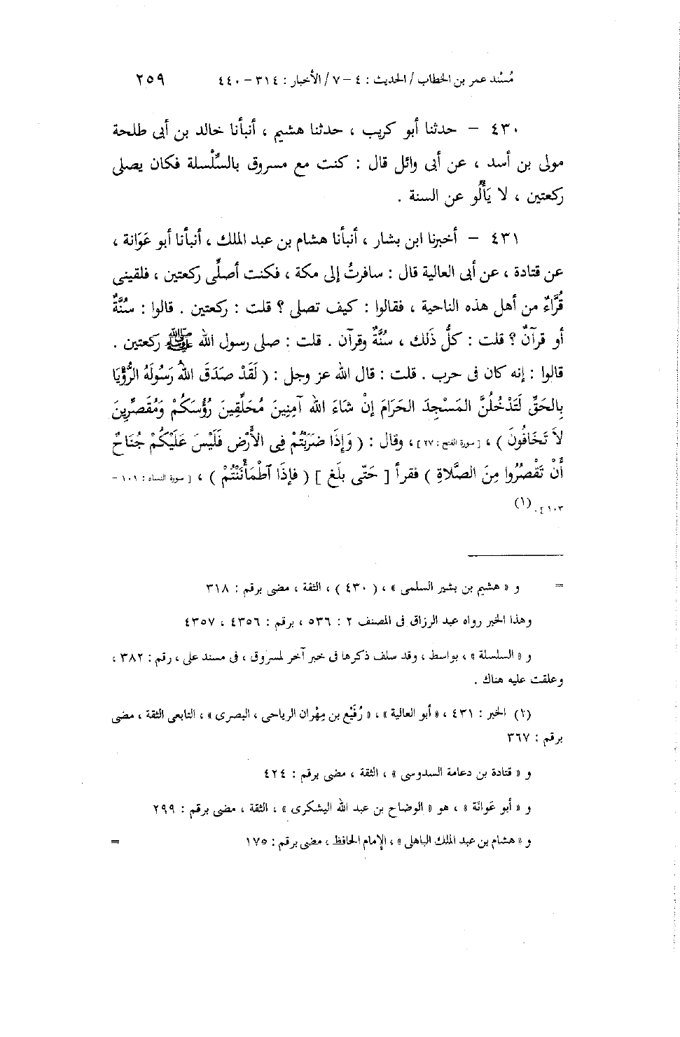 431 - أَخْبَرَنَا ابْنُ بَشَّارٍ، أَنْبَأَنَا هِشَامُ بْنُ عَبْدِ الْمَلِكِ، أَنْبَأَنَا أَبُو عَوَانَةَ، عَنْ قَتَادَةَ، عَنْ أَبِي الْعَالِيَةِ، قَالَ: سَافَرْتُ إِلَى مَكَّةَ، فَكُنْتُ أُصَلِّي رَكْعَتَيْنِ، فَلَقِيَنِي قُرَّاءٌ مِنْ أَهْلِ هَذِهِ النَّاحِيَةِ، فَقَالُوا: كَيْفَ تُصَلِّي؟ قُلْتُ: رَكْعَتَيْنِ، قَالُوا: سُنَّةٌ أَوْ قُرْآنٌ؟ قُلْتُ: كُلُّ ذَلِكَ، سُنَّةٌ وَقُرْآنٌ. قُلْتُ: «§صَلَّى رَسُولُ اللَّهِ صَلَّى اللهُ عَلَيْهِ وَسَلَّمَ رَكْعَتَيْنِ» قَالُوا: إِنَّهُ كَانَ فِي حَرْبٍ، قُلْتُ: قَالَ اللَّهُ عَزَّ وَجَلَّ: " {لَقَدْ صَدَقَ اللَّهُ رَسُولَهُ الرُّؤْيَا بِالْحَقِّ لَتَدْخُلُنَّ الْمَسْجِدَ الْحَرَامَ إِنْ شَاءَ اللَّهُ آمِنَيْنِ مُحَلِّقِينَ رُءُوسَكُمْ وَمُقَصِّرِينَ لَا تَخَافُونَ} ، وَقَالَ: {وَإِذَا ضَرَبْتُمْ فِي الْأَرْضِ فَلَيْسَ عَلَيْكُمْ جُنَاحٌ أَنْ تَقْصُرُوا مِنَ الصَّلَاةِ} [النساء: 101] ، فَقَرَأَ حَتَّى بَلَغَ: {فَإِذَا اطْمَأْنَنْتُمْ} [النساء: 103] "