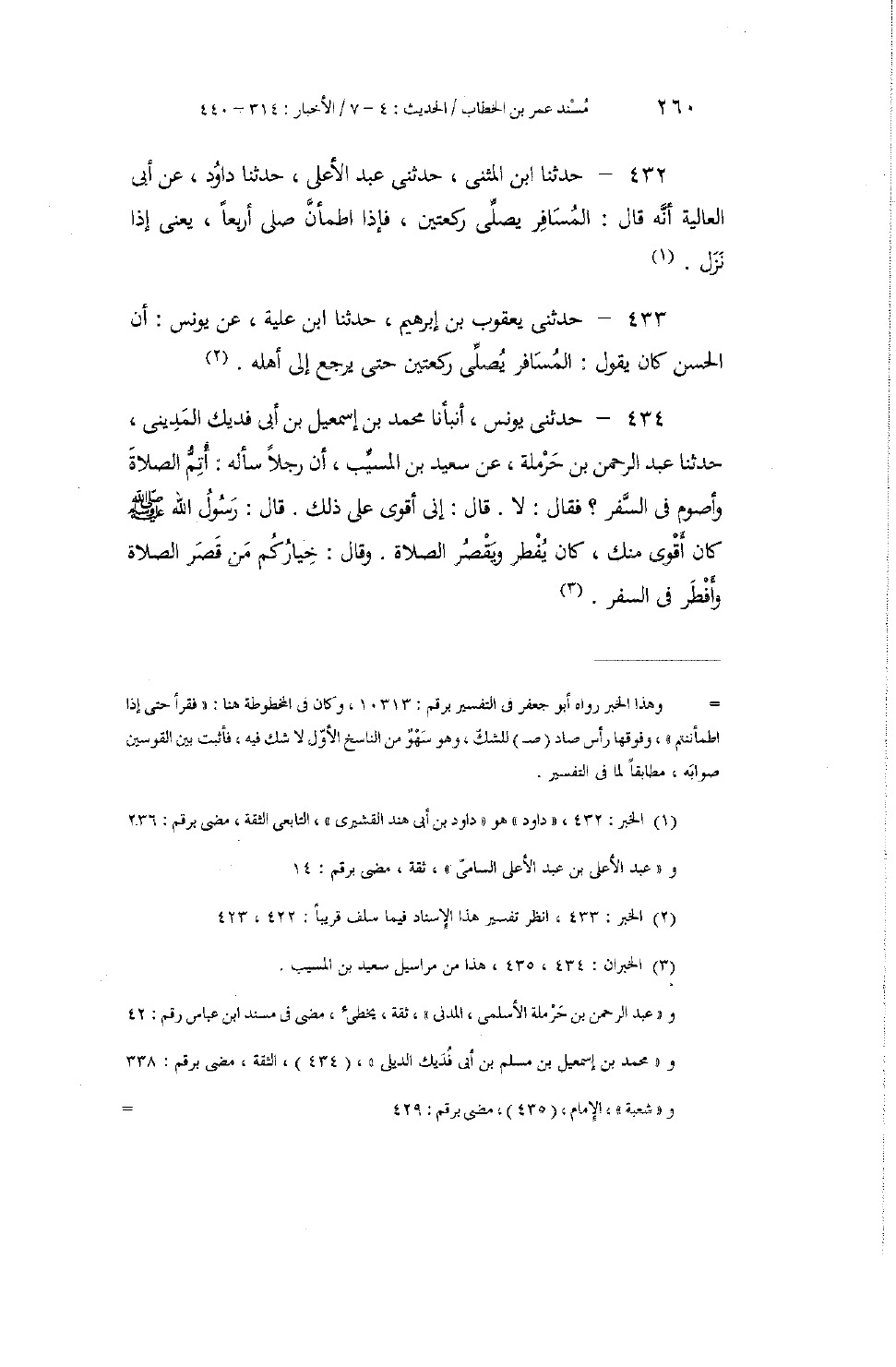 434 - حَدَّثَنِي يُونُسُ، أَنْبَأَنَا مُحَمَّدُ بْنُ إِسْمَاعِيلَ بْنِ أَبِي فُدَيْكٍ الْمَدِينِيُّ، حَدَّثَنَا عَبْدُ الرَّحْمَنِ بْنُ حَرْمَلَةَ، عَنْ سَعِيدِ بْنِ الْمُسَيِّبِ أَنَّ رَجُلًا سَأَلَهُ: أُتِمُّ الصَّلَاةُ وَأَصُومُ فِي السَّفَرِ؟ فَقَالَ: لَا، قَالَ: إِنِّي أَقْوَى عَلَى ذَلِكَ. قَالَ: رَسُولُ اللَّهِ صَلَّى اللهُ عَلَيْهِ وَسَلَّمَ كَانَ أَقْوَى مِنْكَ، كَانَ يُفْطِرُ وَيَقْصُرُ الصَّلَاةَ، وَقَالَ: «§خِيَارُكُمْ مَنْ قَصَرَ الصَّلَاةَ وَأَفْطَرَ فِي السَّفَرِ»