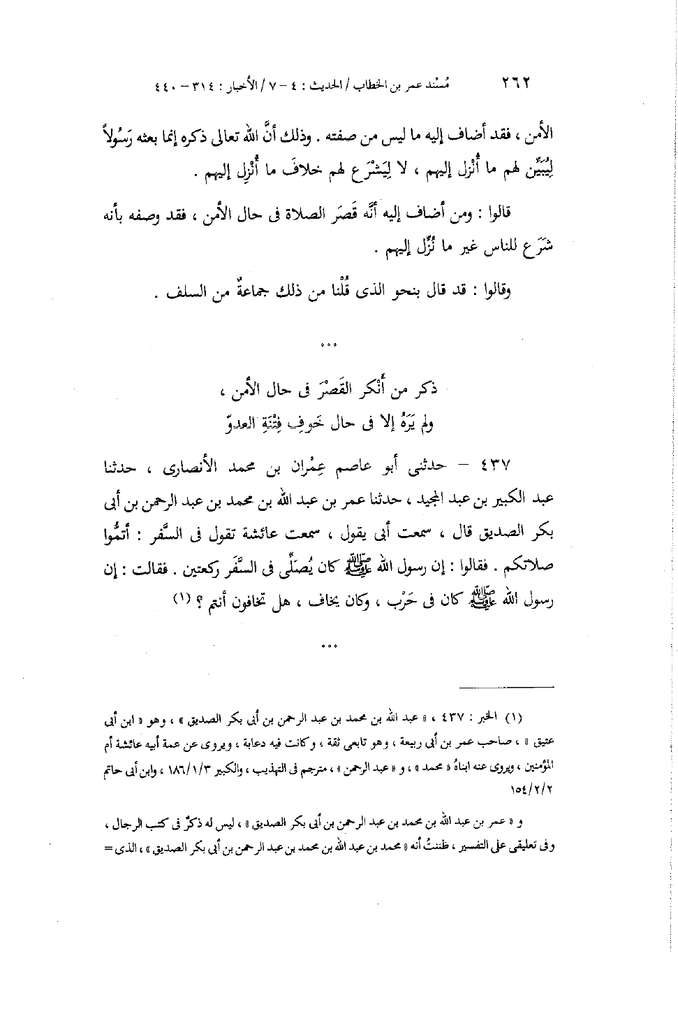 437 - حَدَّثَنِي أَبُو عَاصِمٍ عِمْرَانُ بْنُ مُحَمَّدٍ الْأَنْصَارِيُّ، حَدَّثَنَا عَبْدُ الْكَبِيرِ بْنُ عَبْدِ الْمَجِيدِ، حَدَّثَنَا عُمَرُ بْنُ عَبْدِ اللَّهِ بْنِ مُحَمَّدِ بْنِ عَبْدِ الرَّحْمَنِ بْنِ أَبِي بَكْرٍ الصِّدِّيقِ، قَالَ: سَمِعْتُ أَبِي يَقُولُ: سَمِعْتُ عَائِشَةَ تَقُولُ فِي السَّفَرِ: «أَتِمُّوا صَلَاتَكُمْ» فَقَالُوا: إِنَّ رَسُولَ اللَّهِ صَلَّى اللهُ عَلَيْهِ وَسَلَّمَ كَانَ يُصَلِّي فِي السَّفَرِ رَكْعَتَيْنِ. فَقَالَتْ: " إِنَّ رَسُولَ اللَّهِ صَلَّى اللهُ عَلَيْهِ وَسَلَّمَ §كَانَ فِي حَرْبٍ، وَكَانَ يَخَافُ، هَلْ تَخَافُونَ أَنْتُمْ؟ -[263]- وَالصَّوَابُ مِنَ الْقَوْلِ فِي ذَلِكَ عِنْدَنَا أَنْ يُقَالَ: إِنَّ قَصْرَ الصَّلَاةِ فِي السَّفَرِ - غَيْرُ مَبْلَغِ عَدَدِ صَلَاةِ الْمُقِيمِ - رُخْصَةٌ مِنَ اللَّهِ عَزَّ وَجَلَّ لِلْمُسَافِرِ وَتَخْفِيفٌ مِنْهُ عَنْهُ عَلَى لِسَانِ رَسُولِهِ صَلَّى اللهُ عَلَيْهِ وَسَلَّمَ، كَمَا قَالَ ابْنُ عَبَّاسٍ لِسَائِلِهِ عَنْ ذَلِكَ: سُنَّةُ أَبِي الْقَاسِمِ، وَإِنْ رَغِمْتُمْ. وَقَالَ ابْنُ عُمَرَ إِذْ سُئِلَ عَنْ ذَلِكَ: إِنَّا وَجَدْنَا نَبِيَّنَا صَلَّى اللهُ عَلَيْهِ وَسَلَّمَ يَعْمَلُ عَمَلًا عَمِلْنَا بِهِ. وَذَلِكَ مِنْ حُكْمِ قَوْلِ اللَّهِ عَزَّ وَجَلَّ: {وَإِذَا ضَرَبْتُمْ فِي الْأَرْضِ فَلَيْسَ عَلَيْكُمْ جُنَاحٌ أَنْ تَقْصُرُوا مِنَ الصَّلَاةِ إِنْ خِفْتُمْ أَنْ يَفْتِنَكُمُ الَّذِينَ كَفَرُوا} [النساء: 101] بِمَعْزِلٍ؛ وَذَلِكَ أَنَّ هَذِهِ الْآيَةَ نَزَلَتْ فِيمَا ذُكِرَ عَلَى رَسُولِ اللَّهِ صَلَّى اللهُ عَلَيْهِ وَسَلَّمَ؛ تَعْلِيمًا مِنَ اللَّهِ عَزَّ وَجَلَّ لَهُ صَلَاةَ الْخَوْفِ عِنْدَ مُعَايَنَتِهِ الْعَدُوَّ الْمَخُوفَةَ غَائِلَتُهُ، الْمَحْذُورَ بَائِقَتُهُ، إِذَا هُوَ صَلَّى صَلَاةَ الْآمِنِ الْمُطْمَئِنِّ. وَبِالَّذِي قُلْنَا فِي ذَلِكَ تَوَاتَرَتِ الْأَخْبَارُ عَنْ أَصْحَابِ رَسُولِ اللَّهِ صَلَّى اللهُ عَلَيْهِ وَسَلَّمَ، وَتَتَابَعَتْ عَلَيْهِ أَقْوَالُ أَهْلِ التَّأْوِيلِ. وَقَدِ اسْتَقْصَيْنَا ذِكْرَ أَقْوَالِهِمْ، وَاخْتِلَافِ الْمُخْتَلِفِينَ فِي ذَلِكَ فِي كِتَابِنَا الْمُسَمَّى (جَامِعُ الْبَيَانِ عَنْ تَأْوِيلِ آيِ الْقُرْآنِ) ، غَيْرَ أَنَّا نَذْكُرُ فِي هَذَا الْمَوْضِعِ بَعْضَ ذَلِكَ؛ لِيَعْلَمَ قَارِئُ كِتَابِنَا هَذَا صِحَّةَ مَا قُلْنَا فِي ذَلِكَ
