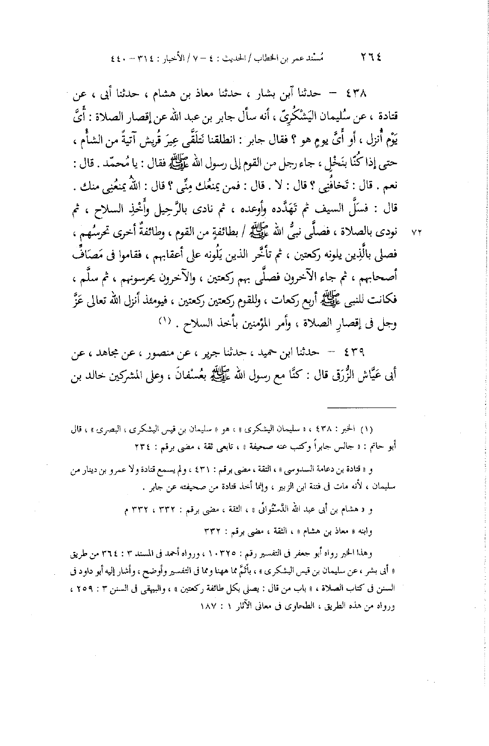 438 - حَدَّثَنَا ابْنُ بَشَّارٍ، حَدَّثَنَا مُعَاذُ بْنُ هِشَامٍ، حَدَّثَنَا أَبِي، عَنْ قَتَادَةَ، عَنْ سُلَيْمَانَ الْيَشْكُرِيِّ، أَنَّهُ سَأَلَ جَابِرَ بْنَ عَبْدِ اللَّهِ عَنْ إِقْصَارِ الصَّلَاةِ: أَيَّ يَوْمٍ أُنْزِلَ، أَوْ أَيَّ يَوْمٍ هُوَ؟ فَقَالَ جَابِرٌ: انْطَلَقْنَا نَتَلَقَّى عِيرَ قُرَيْشٍ آتِيَةً مِنَ الشَّأْمِ، حَتَّى إِذَا كُنَّا بِنَخْلٍ جَاءَ رَجُلٌ مِنَ الْقَوْمِ إِلَى رَسُولِ اللَّهِ صَلَّى اللهُ عَلَيْهِ وَسَلَّمَ فَقَالَ: يَا مُحَمَّدُ. قَالَ: «نَعَمْ» . قَالَ: تَخَافُنِي؟ قَالَ: «لَا» . قَالَ: فَمَنْ يَمْنَعُكَ مِنِّي؟ قَالَ: «§اللَّهُ يَمْنَعُنِي مِنْكَ» . قَالَ: فَسَلَّ السَّيْفَ، ثُمَّ تَهَدَّدَهُ وَأَوْعَدَهُ، ثُمَّ نَادَى بِالرَّحِيلِ وَأَخْذِ السِّلَاحِ، ثُمَّ نُودِيَ بِالصَّلَاةِ، فَصَلَّى نَبِيُّ اللَّهِ صَلَّى اللهُ عَلَيْهِ وَسَلَّمَ بِطَائِفَةٍ مِنَ الْقَوْمِ، وَطَائِفَةٌ أُخْرَى تَحْرُسُهُمْ، فَصَلَّى بِالَّذِينَ يَلُونَهُ رَكْعَتَيْنِ، ثُمَّ تَأَخَّرَ الَّذِينَ يَلُونَهُ عَلَى أَعْقَابِهِمْ، فَقَامُوا فِي مَصَافِّ أَصْحَابِهِمْ، ثُمَّ جَاءَ الْآخَرُونَ فَصَلَّى بِهِمْ رَكْعَتَيْنِ، وَالْآخَرُونَ يَحْرُسُونَهُمْ، ثُمَّ سَلَّمَ، فَكَانَتْ لِلنَّبِيِّ صَلَّى اللهُ عَلَيْهِ وَسَلَّمَ أَرْبَعُ رَكَعَاتٍ، وَلِلْقَوْمِ رَكْعَتَيْنِ رَكْعَتَيْنِ، فَيَوْمَئِذٍ أَنْزَلَ اللَّهُ تَعَالَى عَزَّ وَجَلَّ فِي إِقْصَارِ الصَّلَاةِ، وَأَمَرَ الْمُؤْمِنِينَ بِأَخْذِ السِّلَاحِ