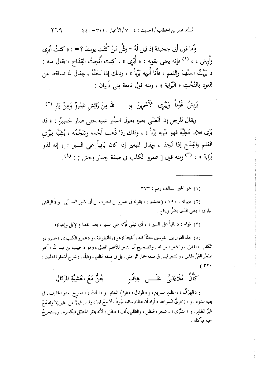 وَأَمَّا قَوْلُ أَبِي جُحَيْفَةَ - إِذْ قِيلَ لَهُ: مِثْلُ مَنْ كُنْتَ يَوْمَئِذٍ؟ كُنْتُ أَبْرِي وَأَرِيشُ، فَإِنَّهُ يَعْنِي بِقَوْلِهِ: أَبْرِي: كُنْتُ أَنْحِتَ الْقِدَاحَ. يُقَالُ مِنْهُ: بَرَيْتُ السَّهْمَ وَالْقَلَمَ، فَأَنَا أَبْرِيهِ بَرْيًا: وَذَلِكَ إِذَا نَحَتُّهُ، وَيُقَالُ لِمَا تَسَاقَطَ مِنَ الْعُودِ بِالنَّحْتِ: الْبُرَايَةُ. وَمِنْهُ قَوْلُ نَابِغَةِ بَنِي ذُبْيَانَ: