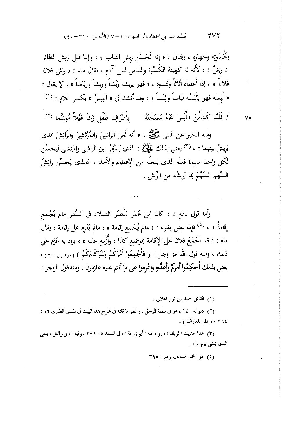 وَمِنْهُ الْخَبَرُ عَنِ النَّبِيِّ صَلَّى اللهُ عَلَيْهِ وَسَلَّمَ: أَنَّهُ لَعَنَ الرَّاشِيَ وَالْمُرْتَشِيَ وَالرَّائِشَ الَّذِي يَرِيشُ بَيْنَهُمَا. يَعْنِي بِذَلِكَ صَلَّى اللهُ عَلَيْهِ وَسَلَّمَ: الَّذِي يَسْفِرُ بَيْنَ الرَّاشِي وَالْمُرْتَشِي لِيُحَسِّنَ لِكُلِّ وَاحِدٍ مِنْهُمَا فِعْلَهُ الَّذِي يَفْعَلُهُ مِنَ الْإِعْطَاءِ وَالْأَخْذِ، كَالَّذِي يُحَسِّنُ رَائِشُ السَّهْمِ السَّهْمَ بِمَا يَرِيشُهُ مِنَ الرِّيشِ. وَأَمَّا قَوْلُ نَافِعٍ: كَانَ ابْنُ عُمَرَ يَقْصُرُ الصَّلَاةَ فِي السَّفَرِ مَا لَمْ يُجْمِعْ إِقَامَةً: فَإِنَّهُ يَعْنِي بِقَوْلِهِ: مَا لَمْ يُجْمِعْ إِقَامَةً: مَا لَمْ يَعْزِمْ عَلَى إِقَامَةٍ. يُقَالُ مِنْهُ: قَدْ أَجْمَعَ فُلَانٌ عَلَى الْإِقَامَةِ بِمَوْضِعِ كَذَا، وَأَزْمَعَ عَلَيْهِ: يُرَادُ بِهِ عَزَمَ عَلَى ذَلِكَ. وَمِنْهُ قَوْلُ اللَّهِ عَزَّ وَجَلَّ: {فَأَجْمِعُوا أَمْرَكُمْ وَشُرَكَاءَكُمْ} [يونس: 71] ، يَعْنِي بِذَلِكَ: أَحْكِمُوا أَمْرَكُمْ، وَأَعِدُّوا وَاعْزِمُوا عَلَى مَا أَنْتُمْ عَلَيْهِ عَازِمُونَ. وَمِنْهُ قَوْلُ الرَّاجِزِ: