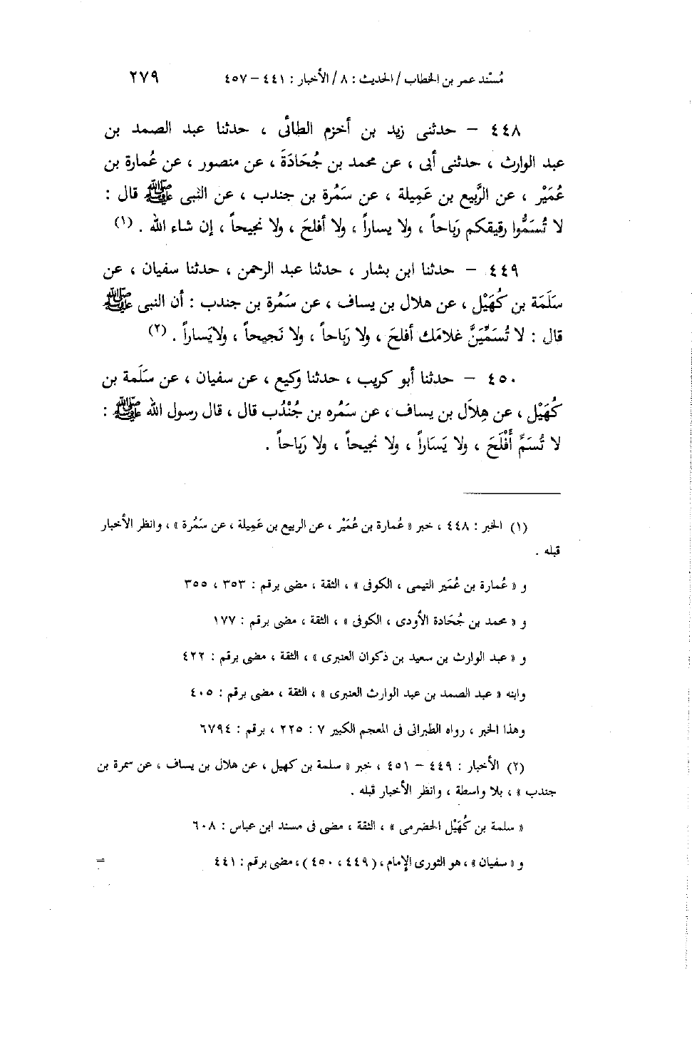 448 - حَدَّثَنِي زَيْدُ بْنُ أَخْزَمَ الطَّائِيُّ، حَدَّثَنَا عَبْدُ الصَّمَدِ بْنُ عَبْدِ الْوَارِثِ، حَدَّثَنِي أَبِي، عَنْ مُحَمَّدِ بْنِ جُحَادَةَ، عَنْ مَنْصُورٍ، عَنْ عُمَارَةَ بْنِ عُمَيْرٍ، عَنِ الرَّبِيعِ بْنِ عَمِيلَةَ، عَنْ سَمُرَةَ بْنِ جُنْدُبٍ عَنِ النَّبِيِّ صَلَّى اللهُ عَلَيْهِ وَسَلَّمَ قَالَ: «§لَا تُسَمَّوْا رَقِيقَكُمْ رَبَاحًا، وَلَا يَسَارًا، وَلَا أَفْلَحَ، وَلَا نَجِيحًا، إِنْ شَاءَ اللَّهُ»
