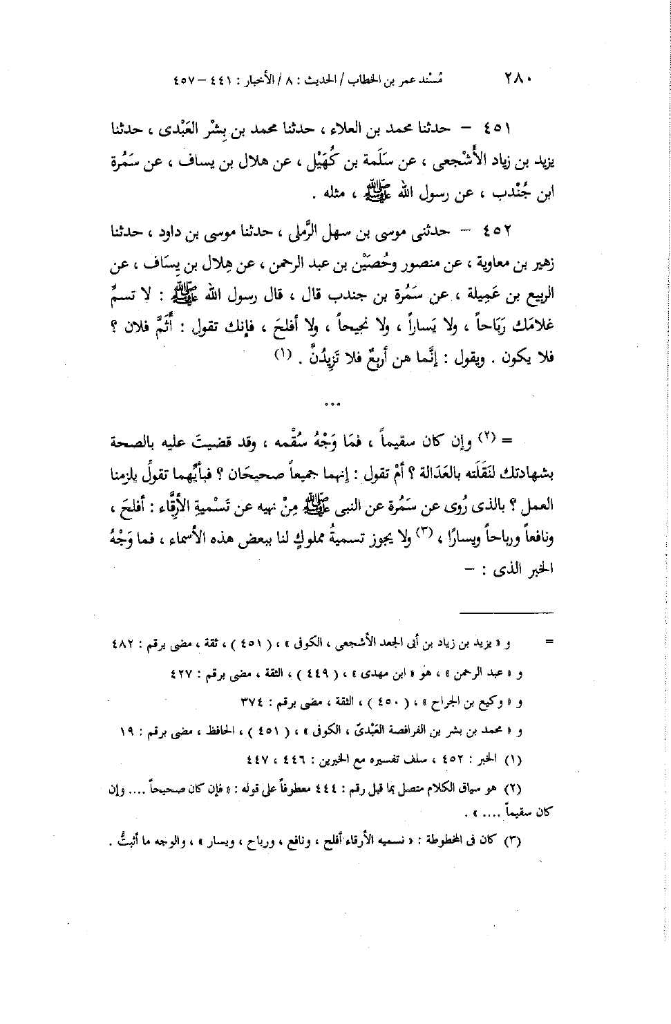 452 - حَدَّثَنِي مُوسَى بْنُ سَهْلٍ الرَّمْلِيُّ، حَدَّثَنَا مُوسَى بْنُ دَاوُدَ، حَدَّثَنَا زُهَيْرُ بْنُ مُعَاوِيَةَ، عَنْ مَنْصُورٍ، وَحُصَيْنِ بْنِ عَبْدِ الرَّحْمَنِ، عَنْ هِلَالِ بْنِ يَسَافٍ، عَنِ الرَّبِيعِ بْنِ عَمِيلَةَ، عَنْ سَمُرَةَ بْنِ جُنْدُبٍ، قَالَ: قَالَ رَسُولُ اللَّهِ صَلَّى اللهُ عَلَيْهِ وَسَلَّمَ: " §لَا تُسَمِّ غُلَامَكَ رَبَاحًا، وَلَا يَسَارًا، وَلَا نَجِيحًا، وَلَا أَفْلَحَ، فَإِنَّكَ تَقُولُ: أَثَمَّ فُلَانٌ؟ فَلَا يَكُونُ. وَيَقُولُ: إِنَّمَا هُنَّ أَرْبَعٌ فَلَا تَزِيدُنَّ " وَإنْ كَانَ سَقِيمًا، فَمَا وَجْهُ سَقَمِهِ، وَقَدْ قَضَيْتَ عَلَيْهِ بِالصِّحَّةِ بِشَهَادَتِكَ لِنَقَلَتِهِ بِالْعَدَالَةِ؟ أَمْ تَقُولُ: إِنَّهُمَا جَمِيعًا صَحِيحَانِ؟ فَبِأَيِّهِمَا تَقُولُ يَلْزَمُنَا الْعَمَلُ؟ بِالَّذِي رُوِيَ عَنْ سَمُرَةَ عَنِ النَّبِيِّ صَلَّى اللهُ عَلَيْهِ وَسَلَّمَ مِنْ نَهْيِهِ عَنْ تَسْمِيَةِ الْأَرِقَاءِ: أَفْلَحَ، وَنَافِعًا، وَرَبَاحًا، وَيَسَارًا، وَلَا يَجُوزُ تَسْمِيَةُ مَمْلُوكٍ لَنَا بِبَعْضِ هَذِهِ الْأَسْمَاءِ، فَمَا وَجْهُ الْخَبَرِ الَّذِي